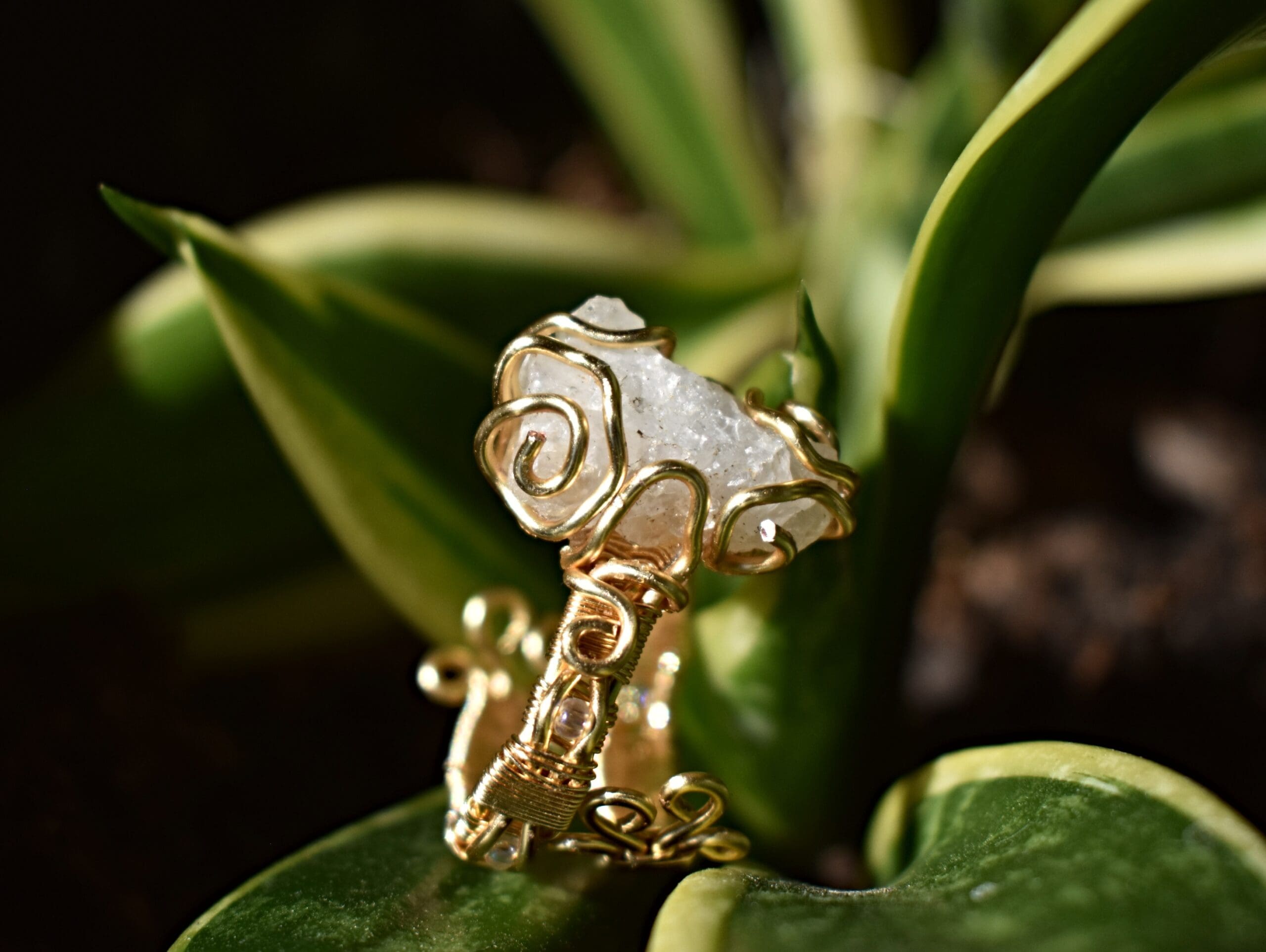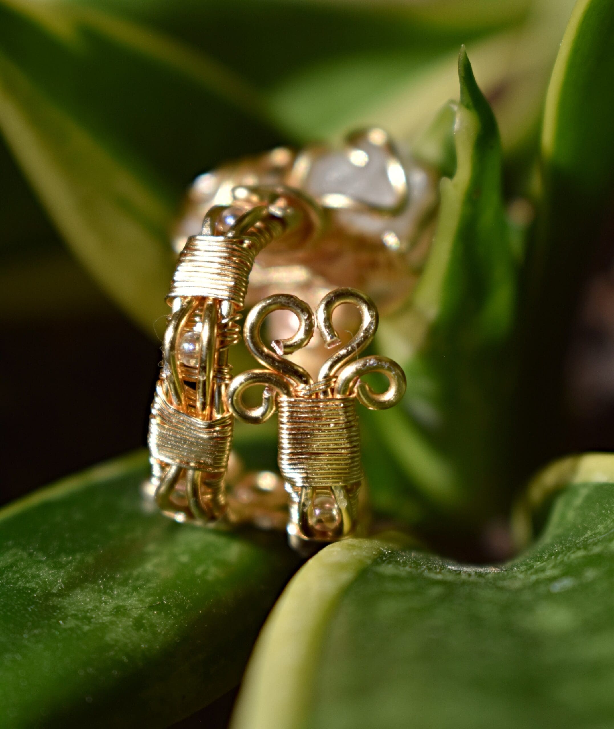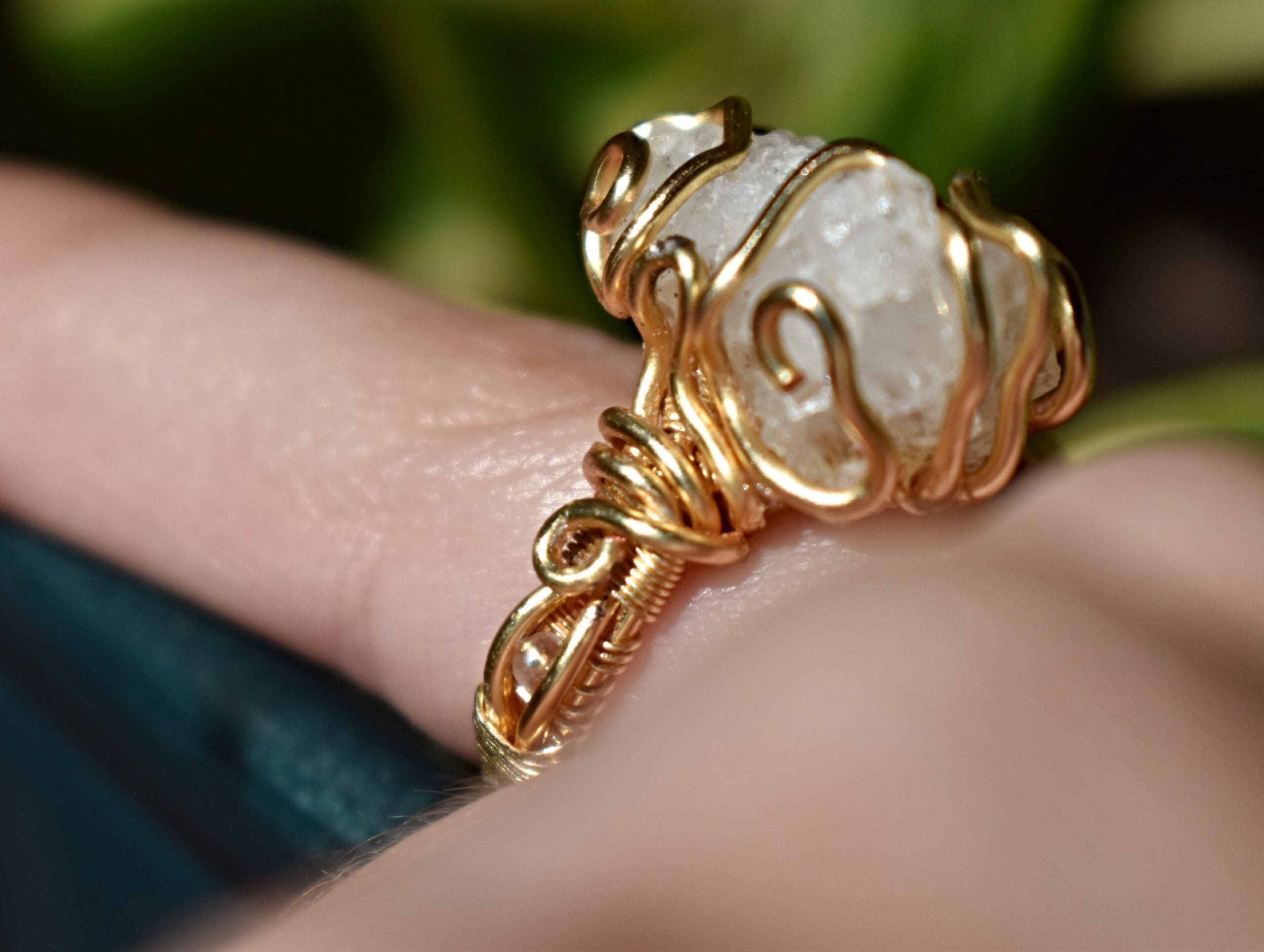 Adjustable from a size 6 to bigger gold wire ring with a white stone in the center. Clear iridescent beads are incorporated in the band.