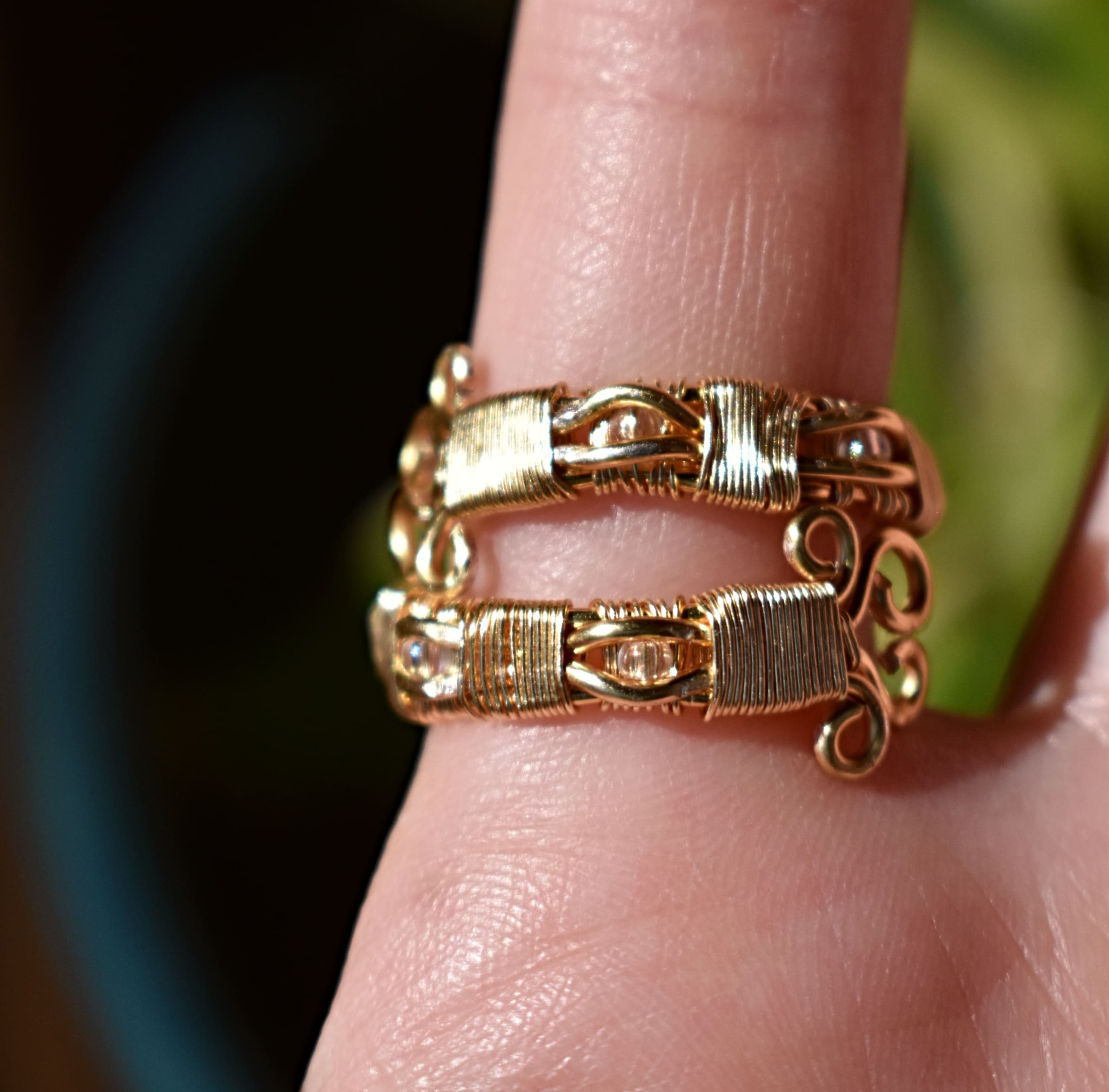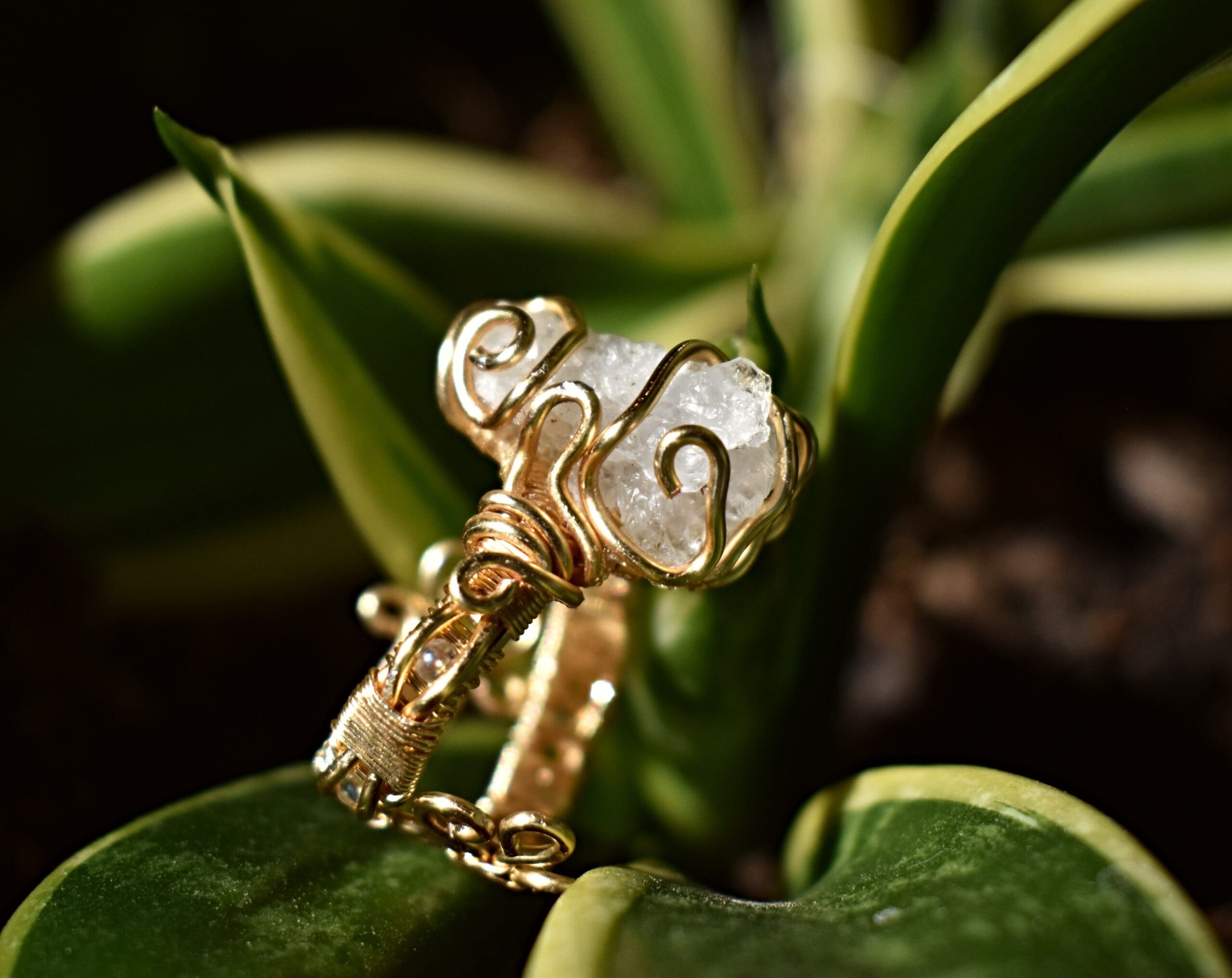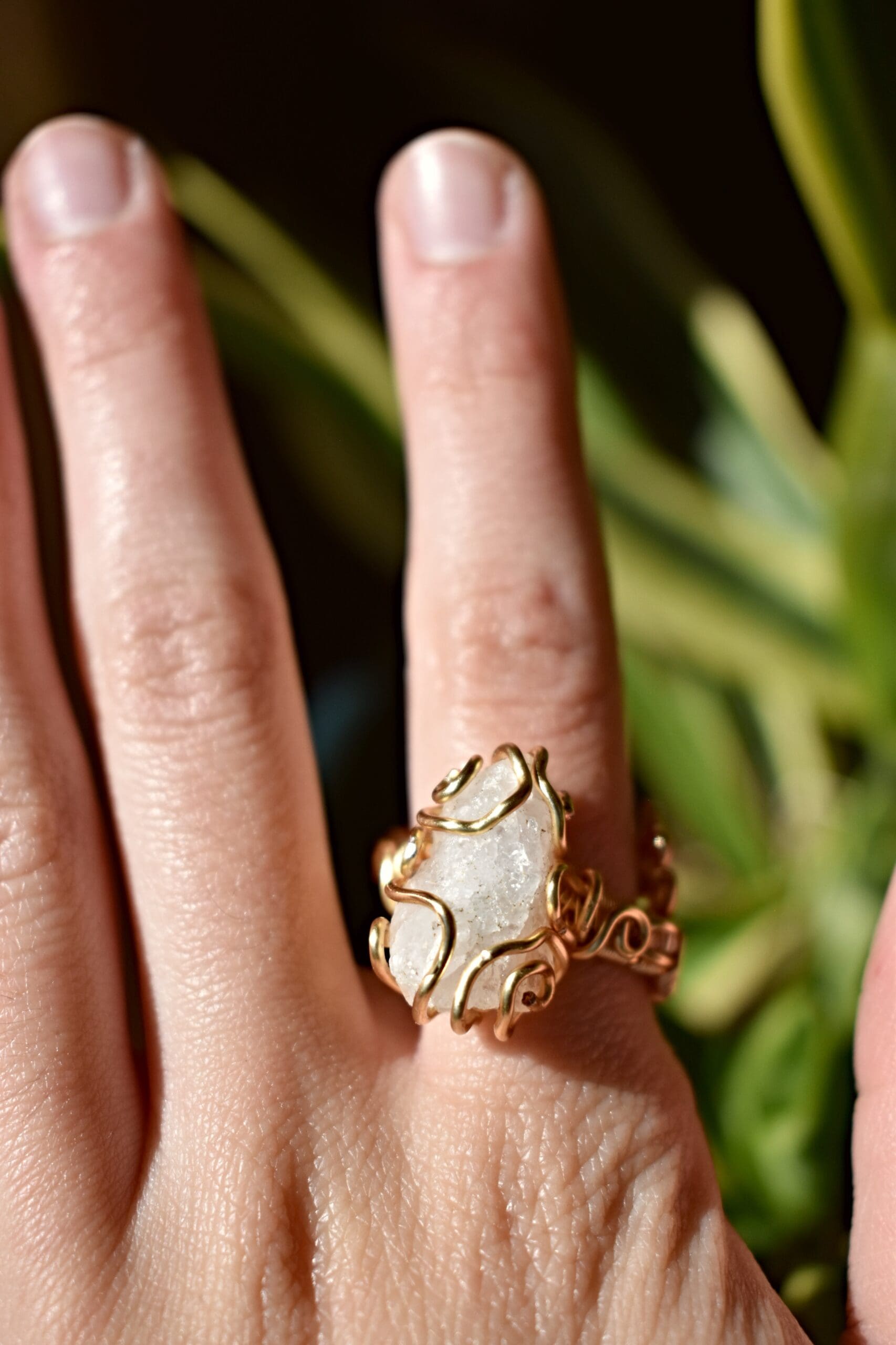 Adjustable from a size 6 to bigger gold wire ring with a white stone in the center. Clear iridescent beads are incorporated in the band.