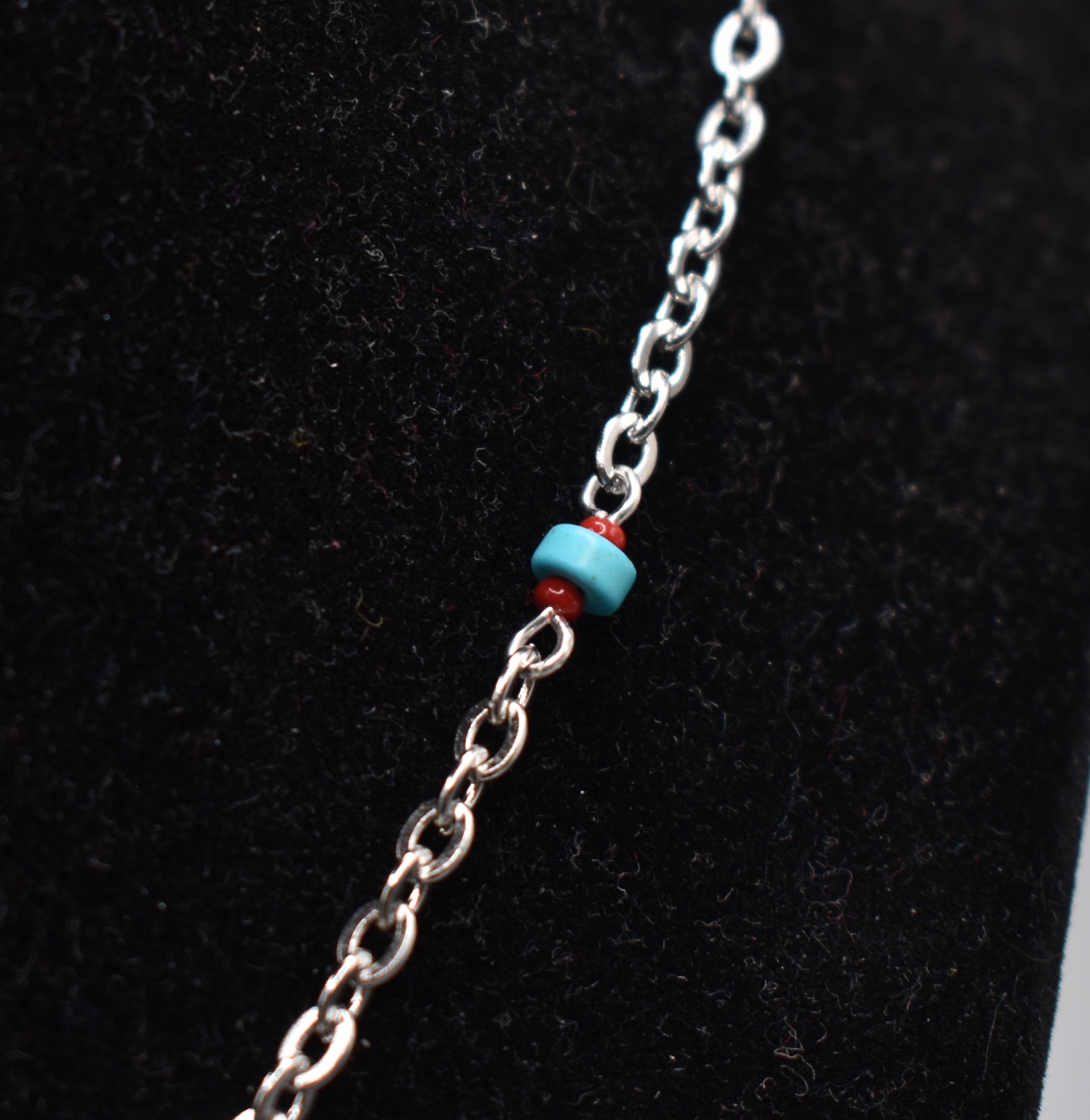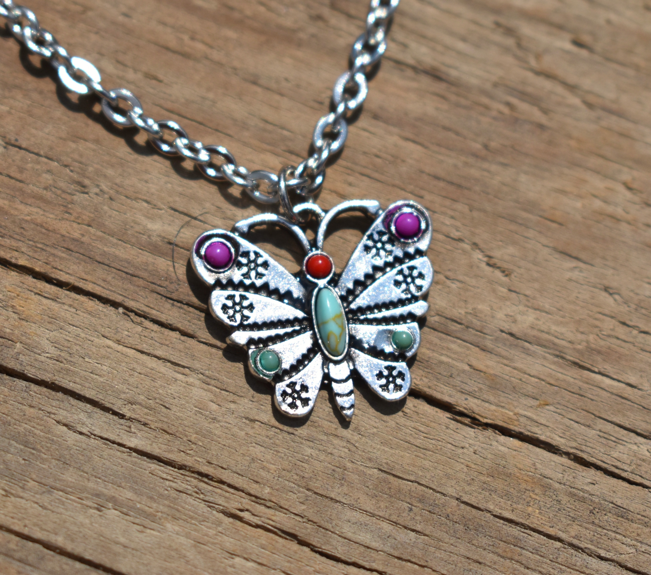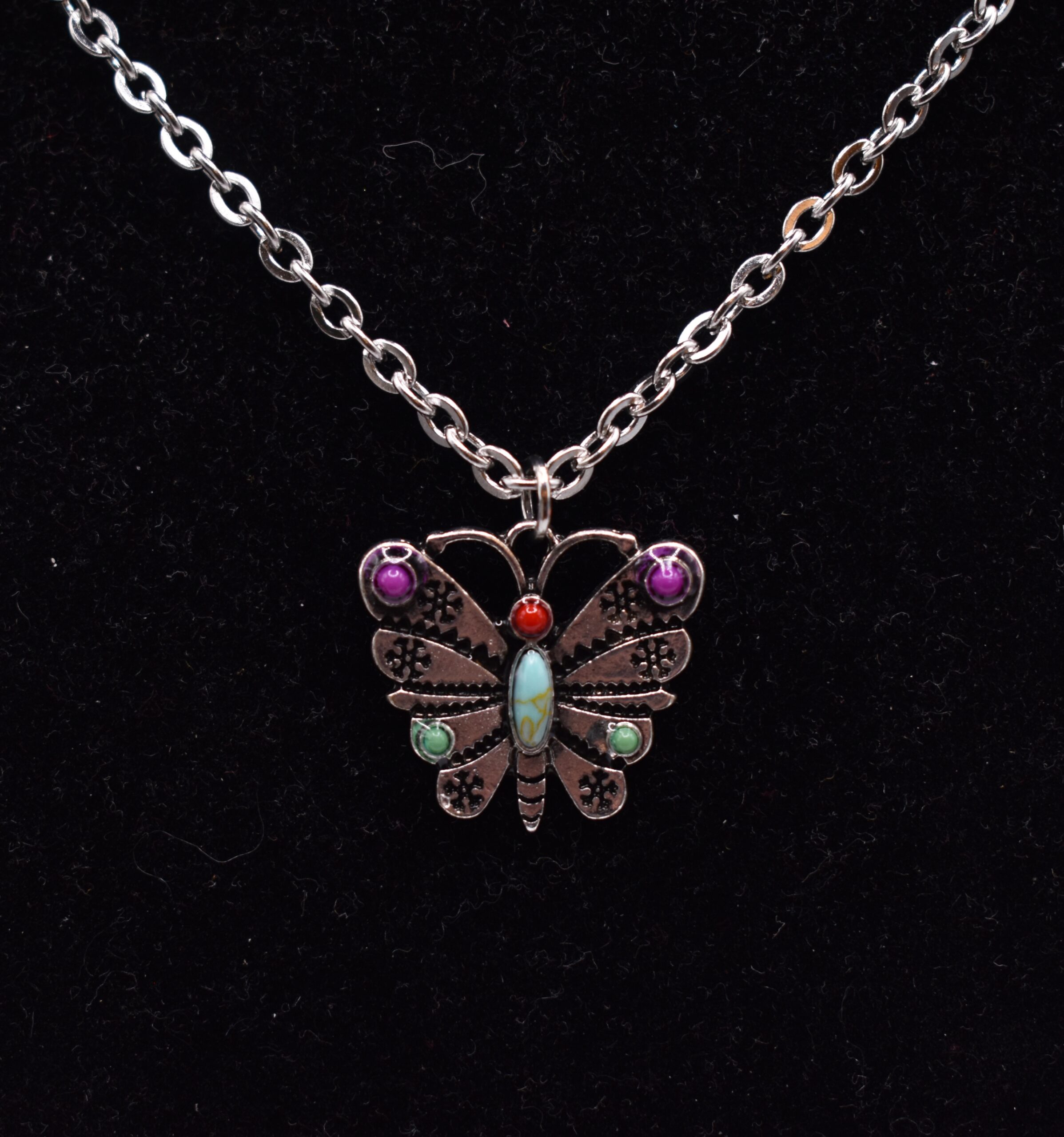 17″ – 18 1/2″ Long silver necklace with butterfly charm and teal and red beads in the chain.