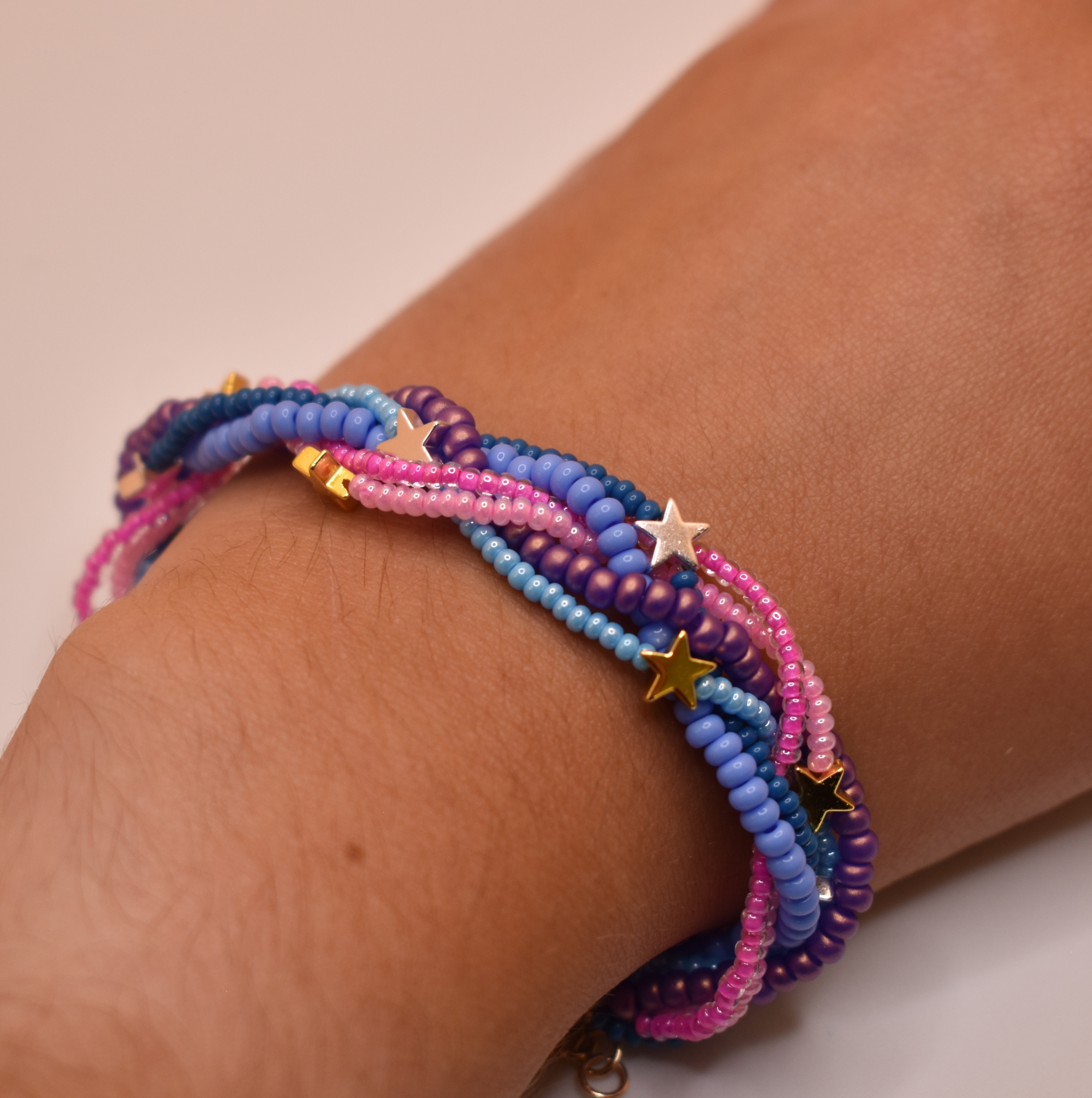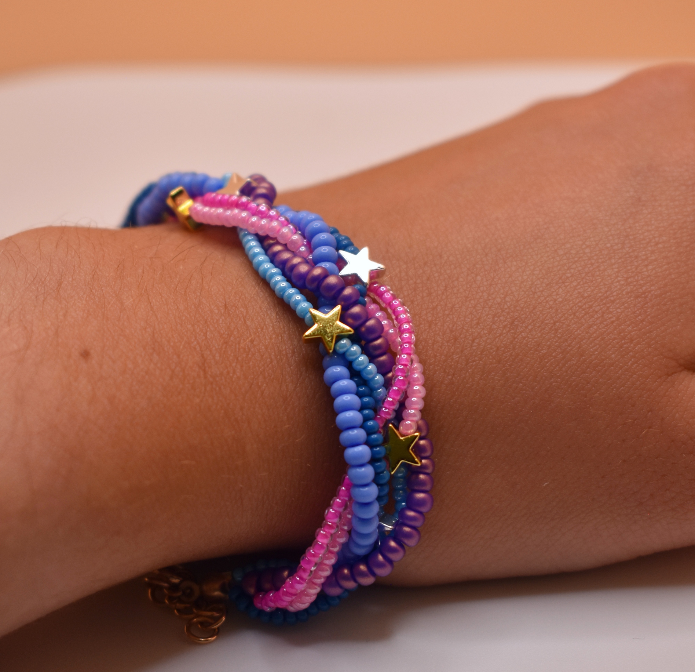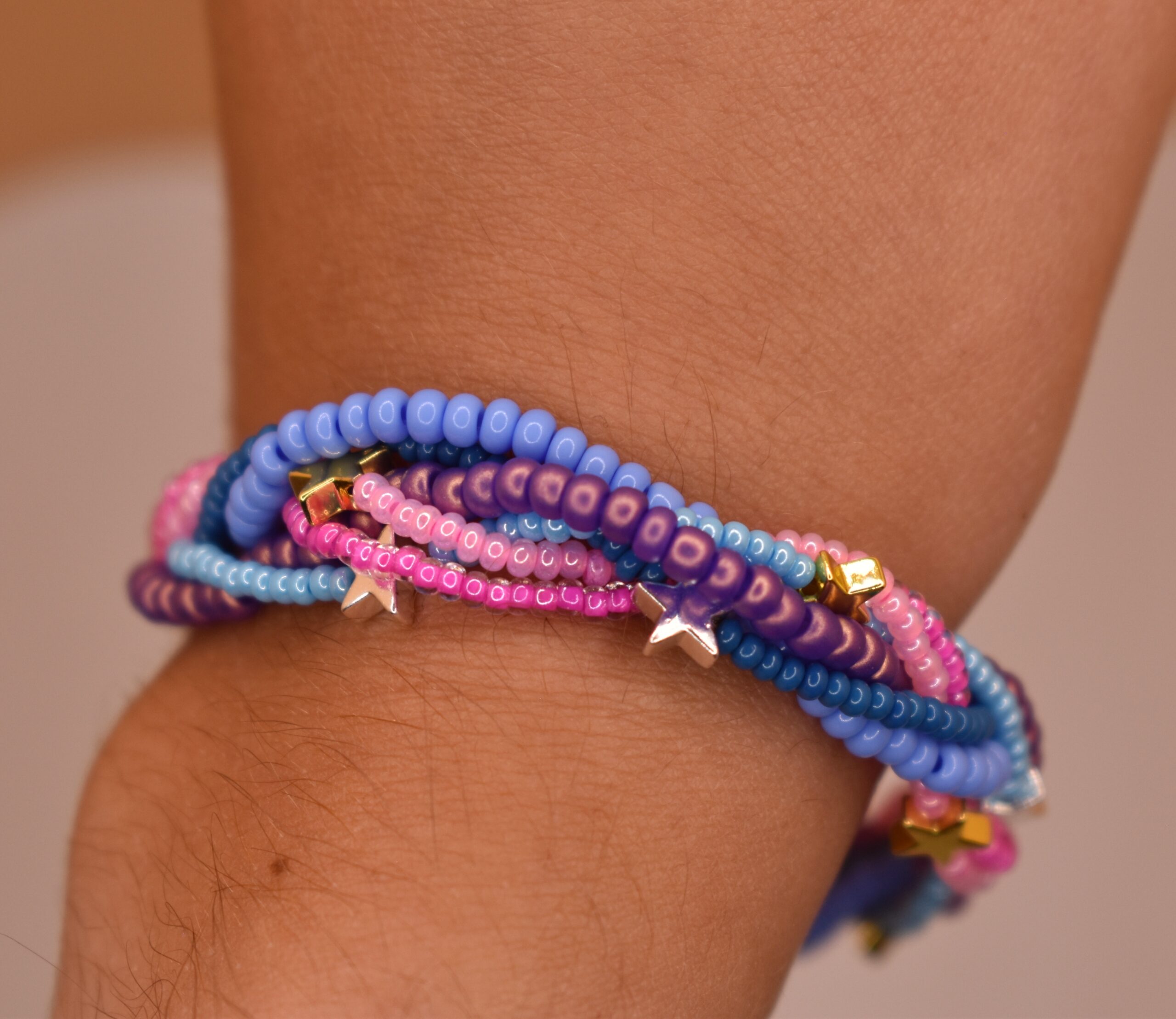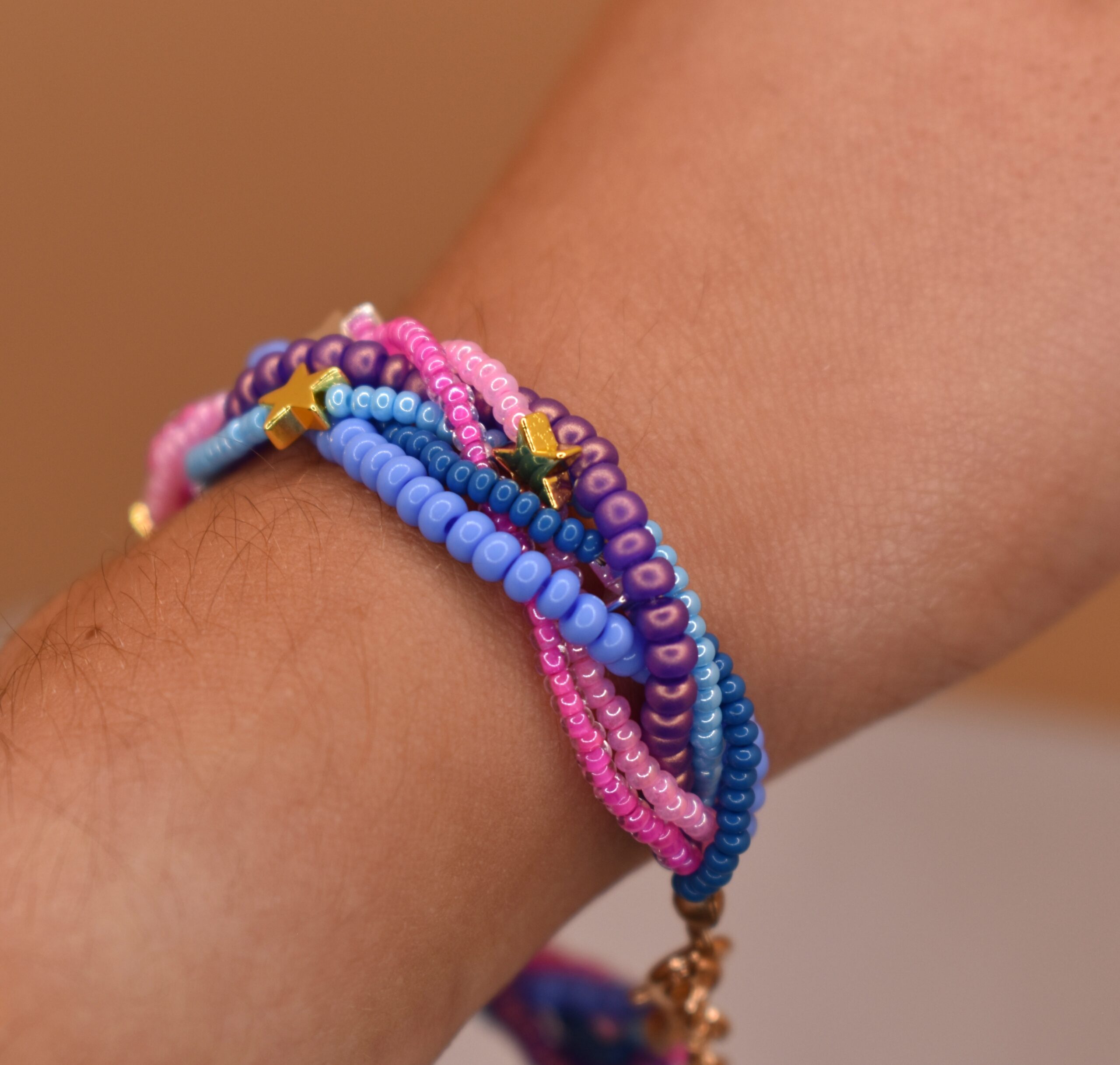 7-8″ Long braided bracelet with pink, blue, and purple, beads with silver and gold star beads mixed in.