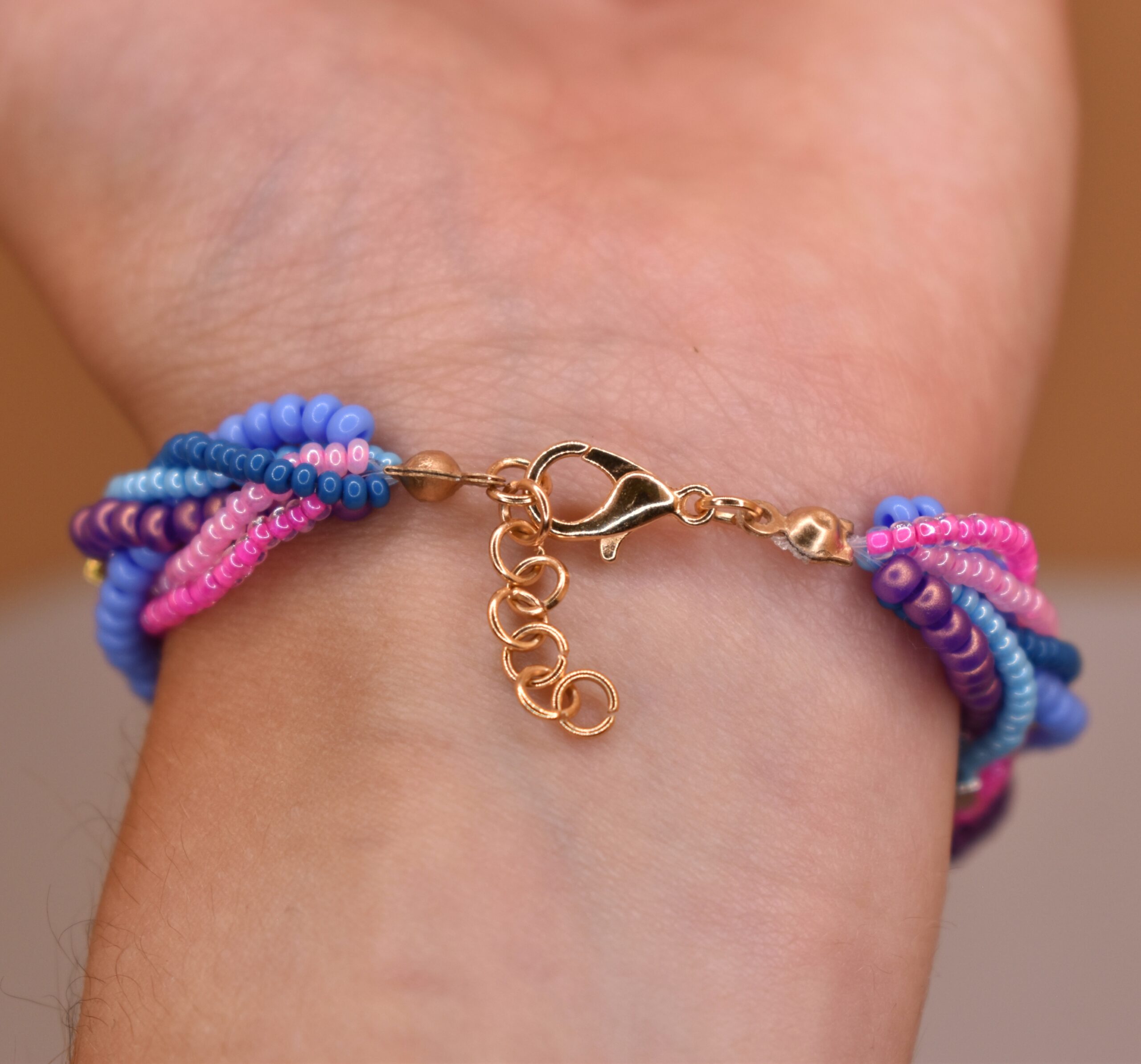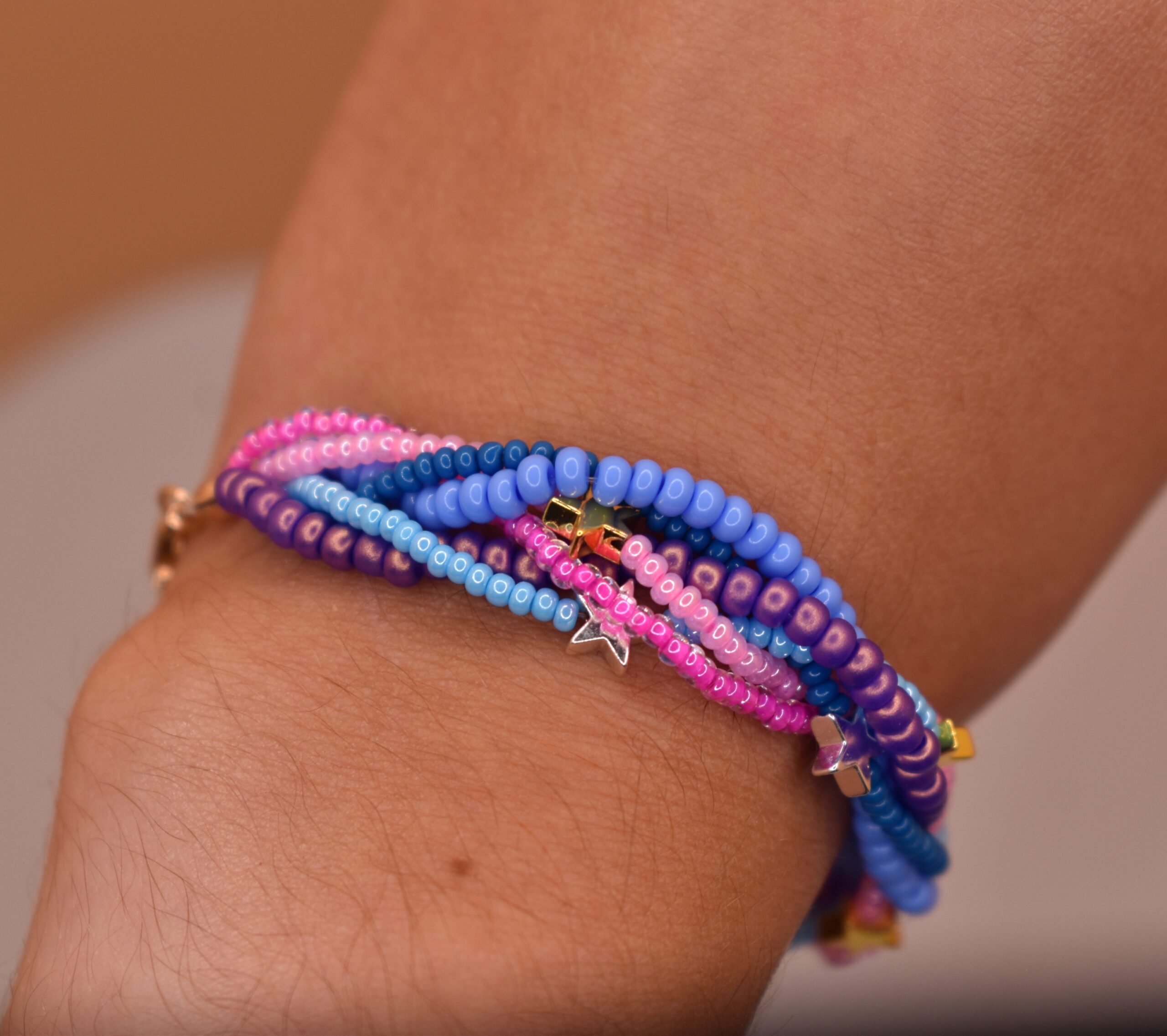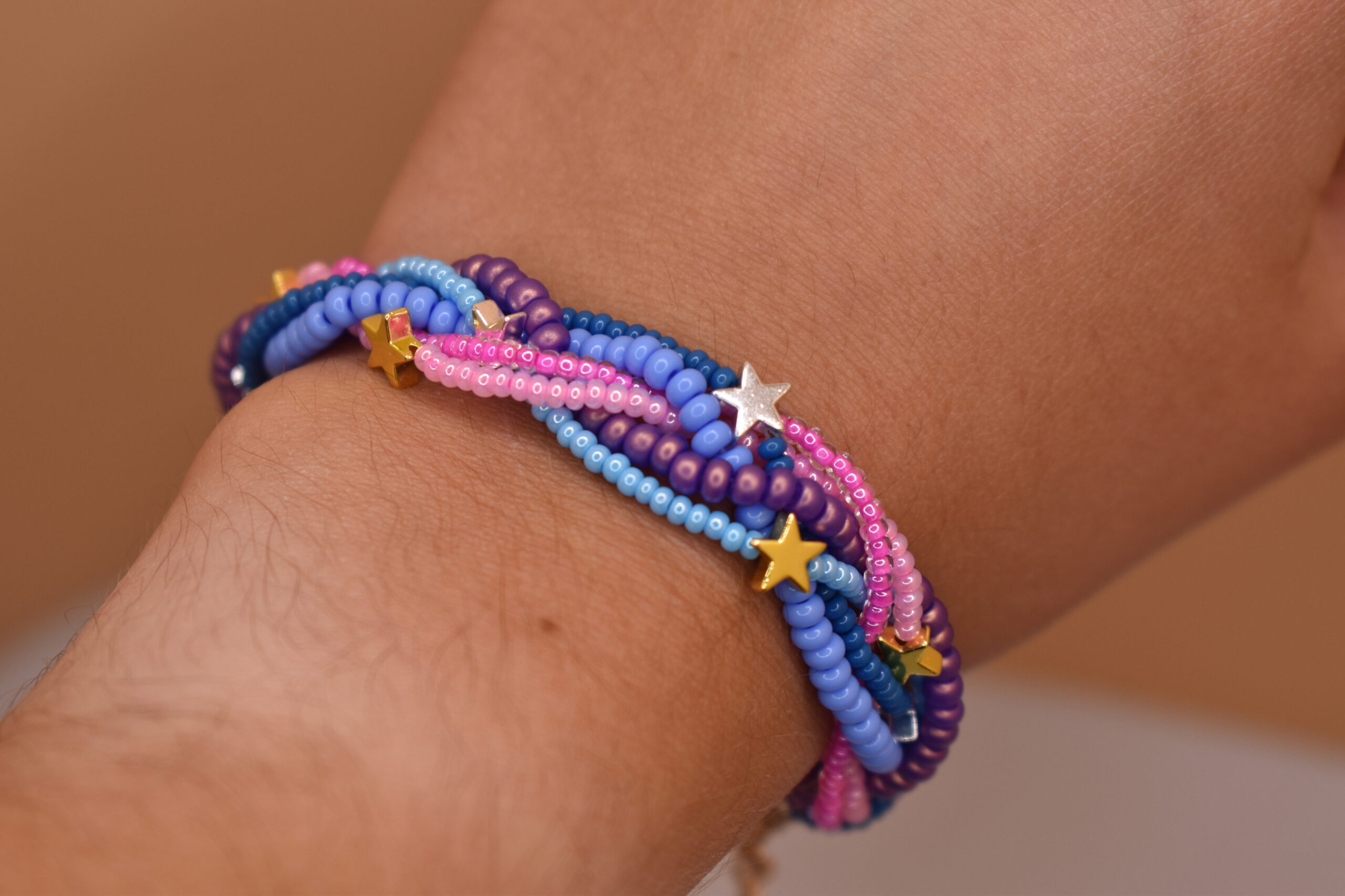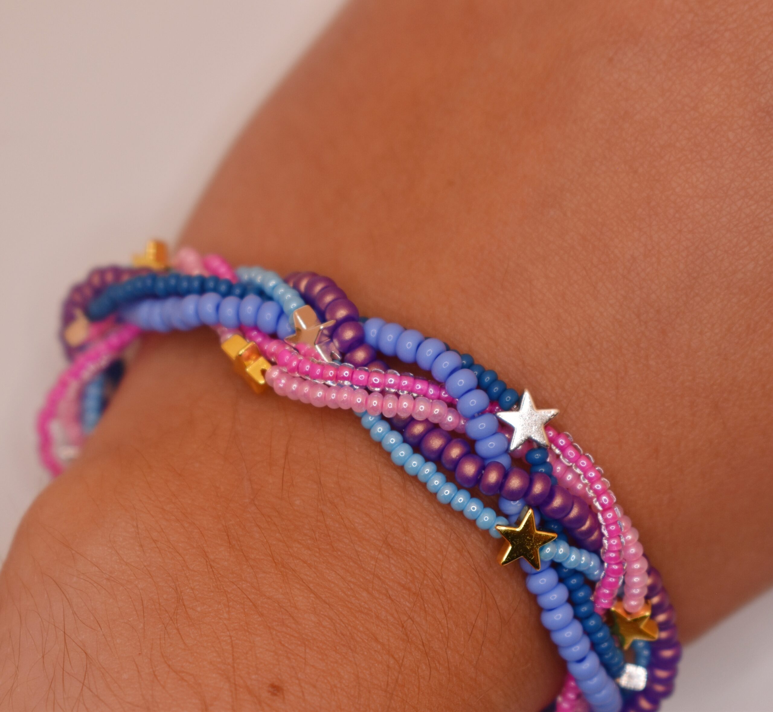7-8″ Long braided bracelet with pink, blue, and purple, beads with silver and gold star beads mixed in.
