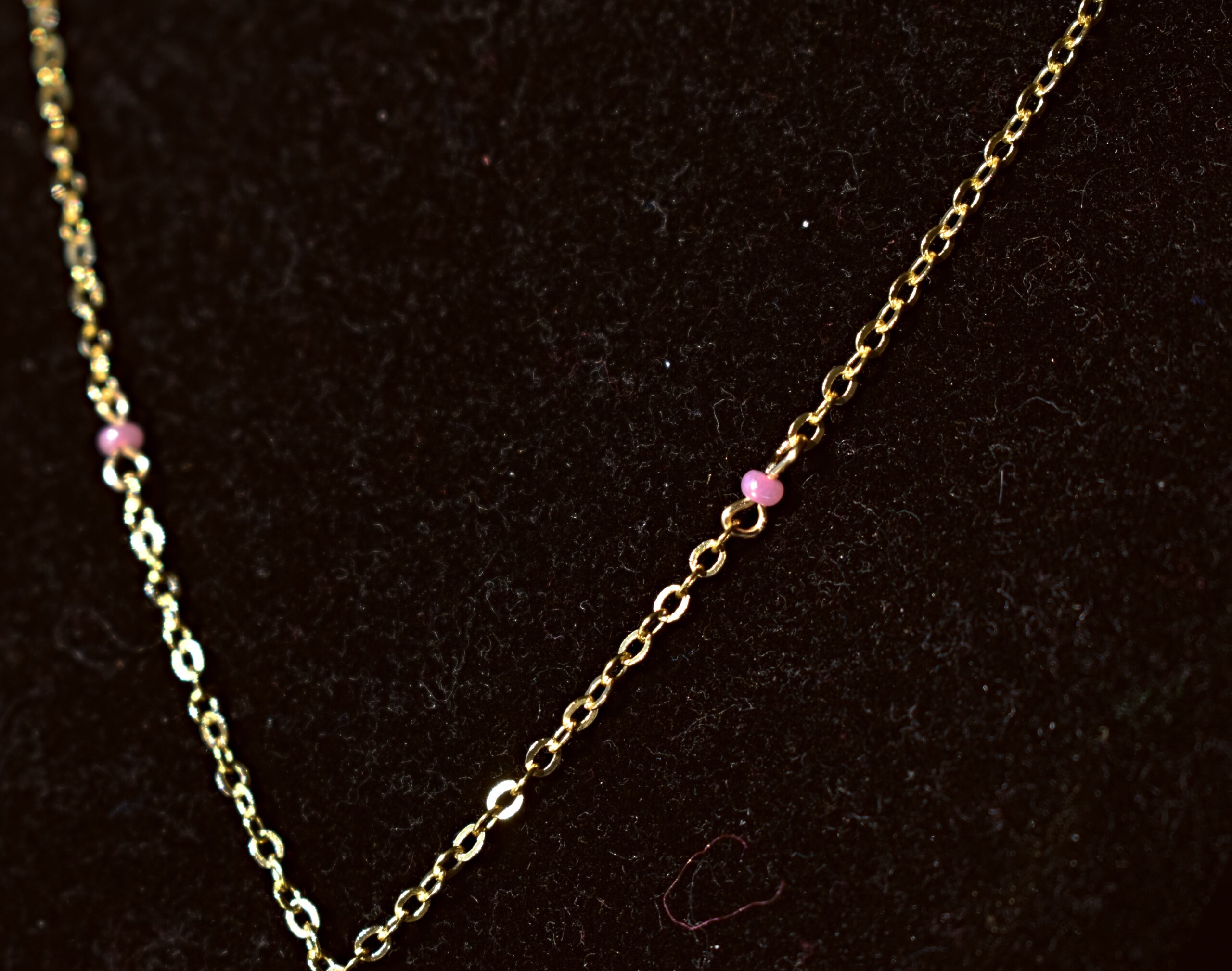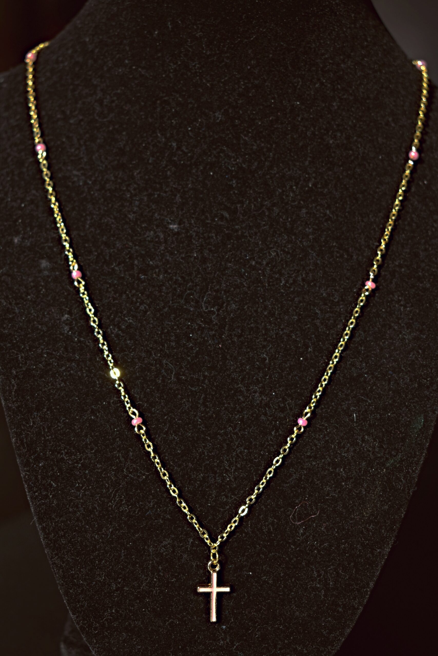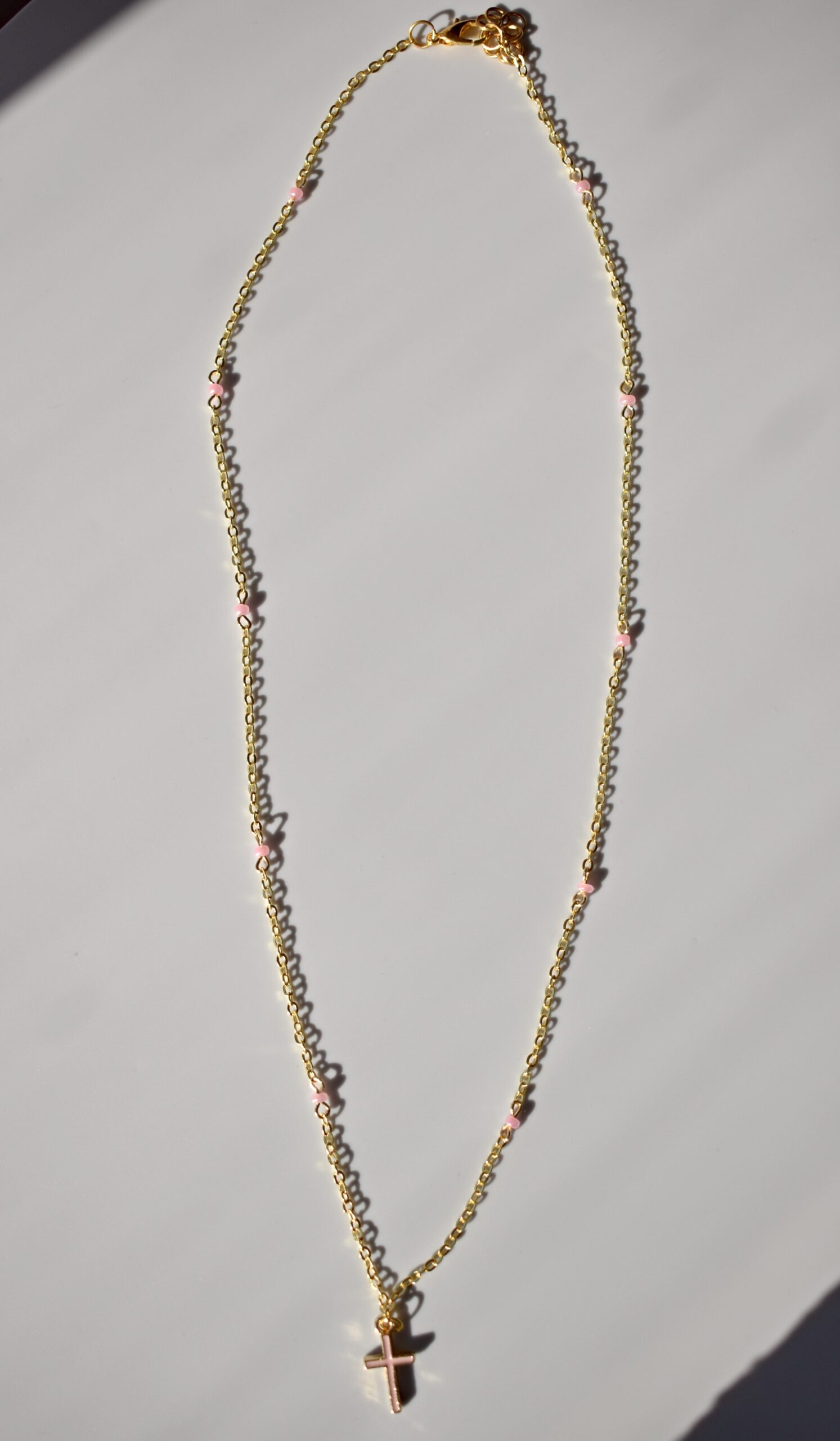20 1/2″ – 21 1/2″ Long necklace with pink beads throughout the gold chain and a pink and gold cross charm in the center.