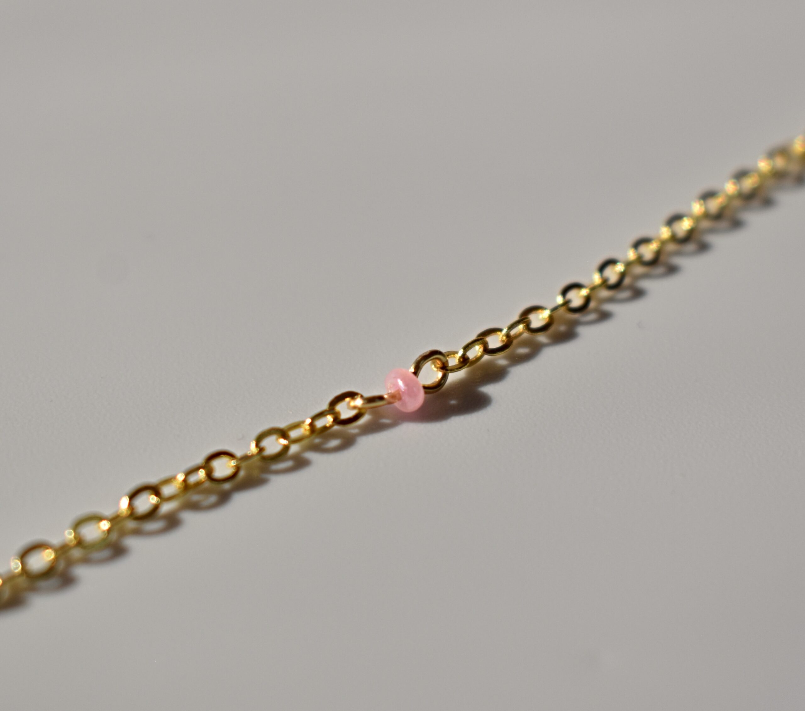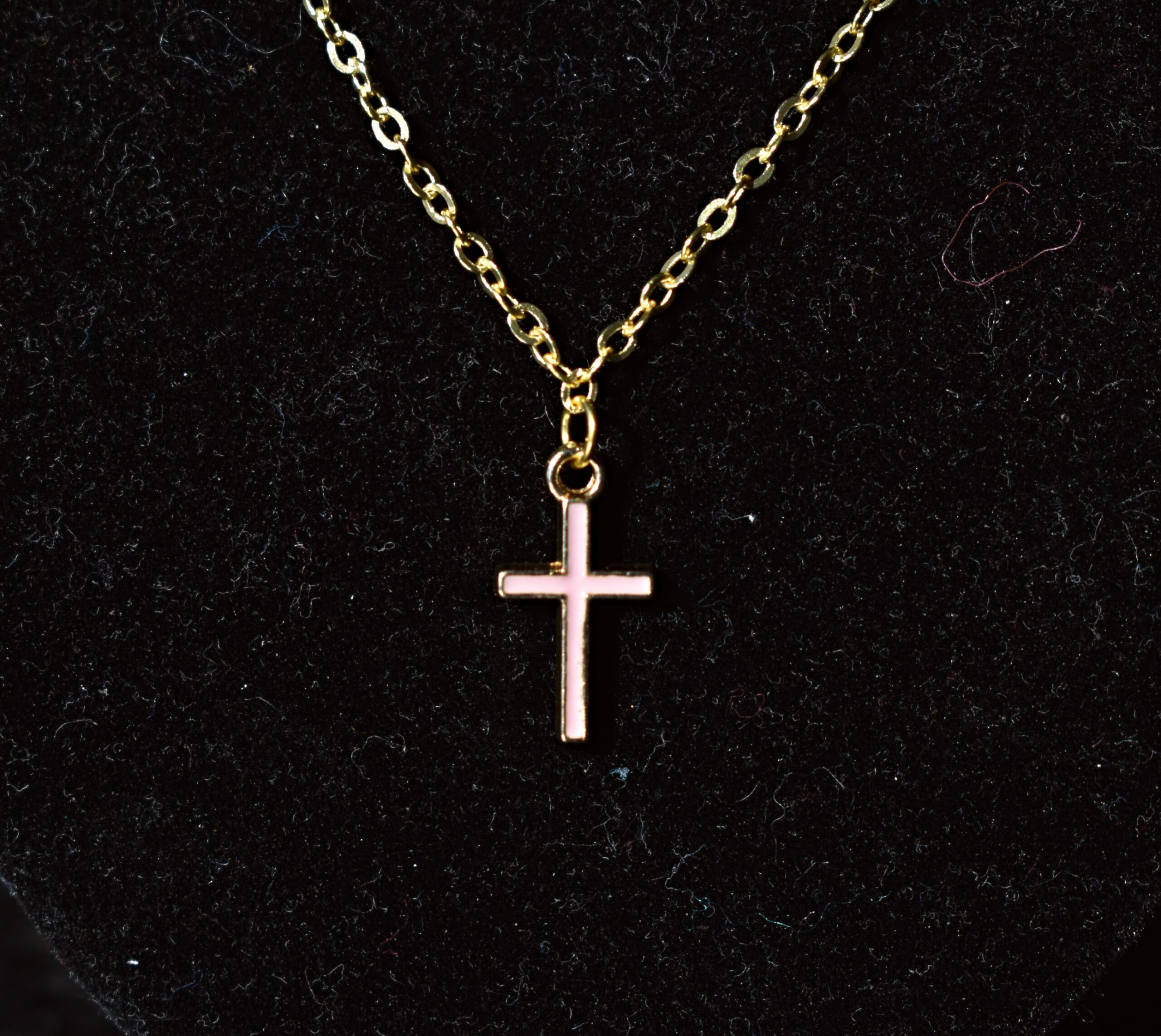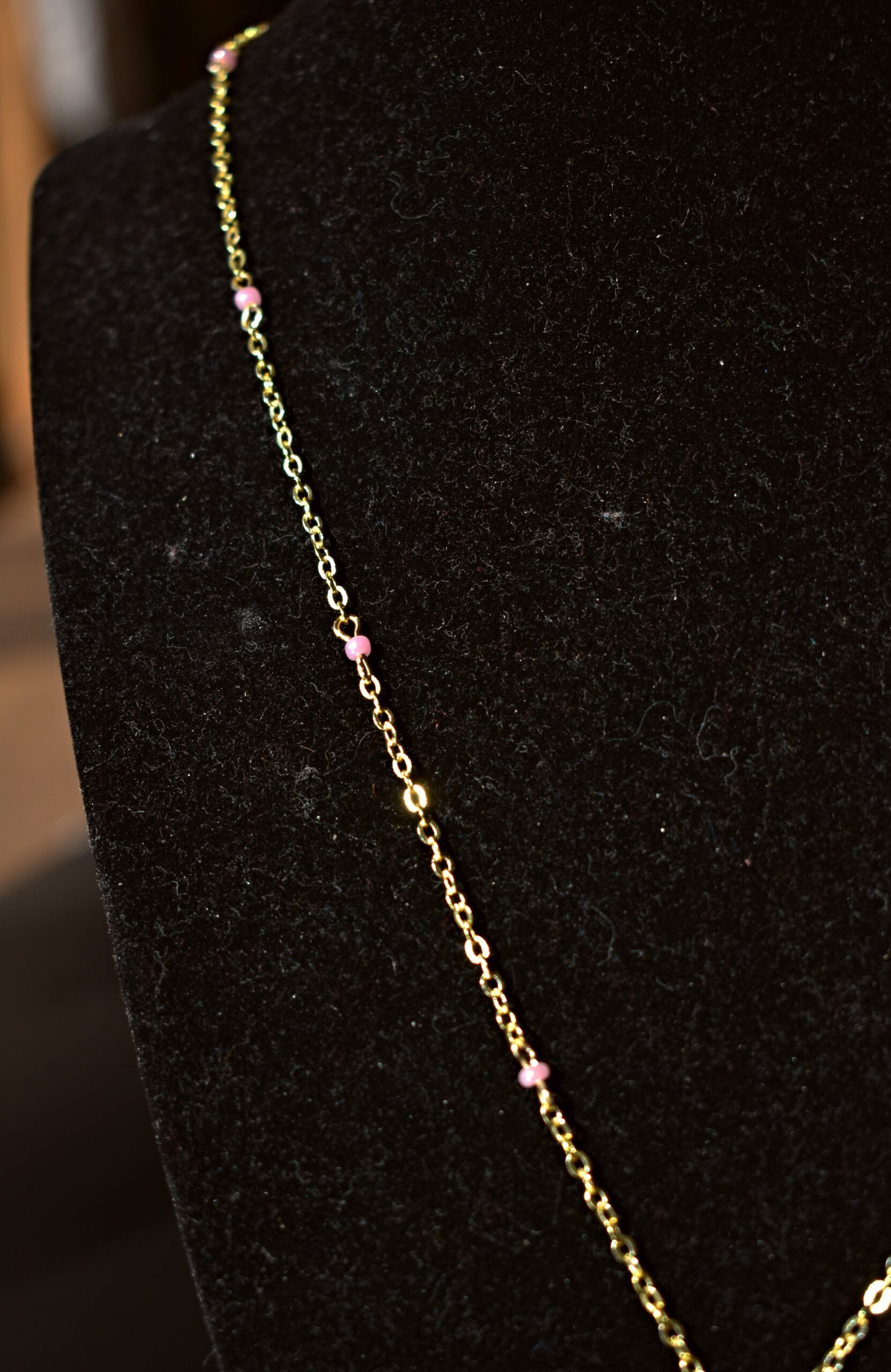 20 1/2″ – 21 1/2″ Long necklace with pink beads throughout the gold chain and a pink and gold cross charm in the center.