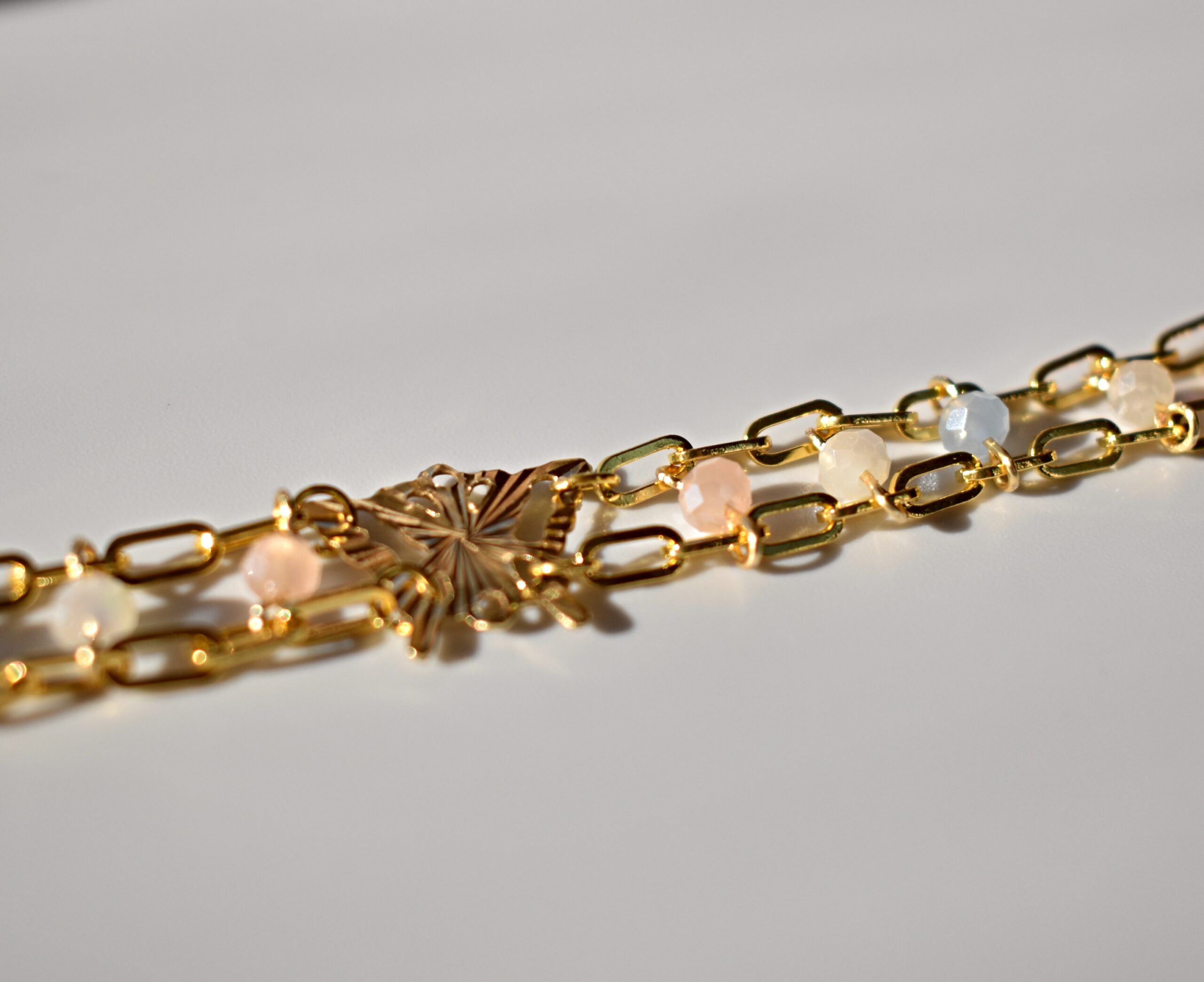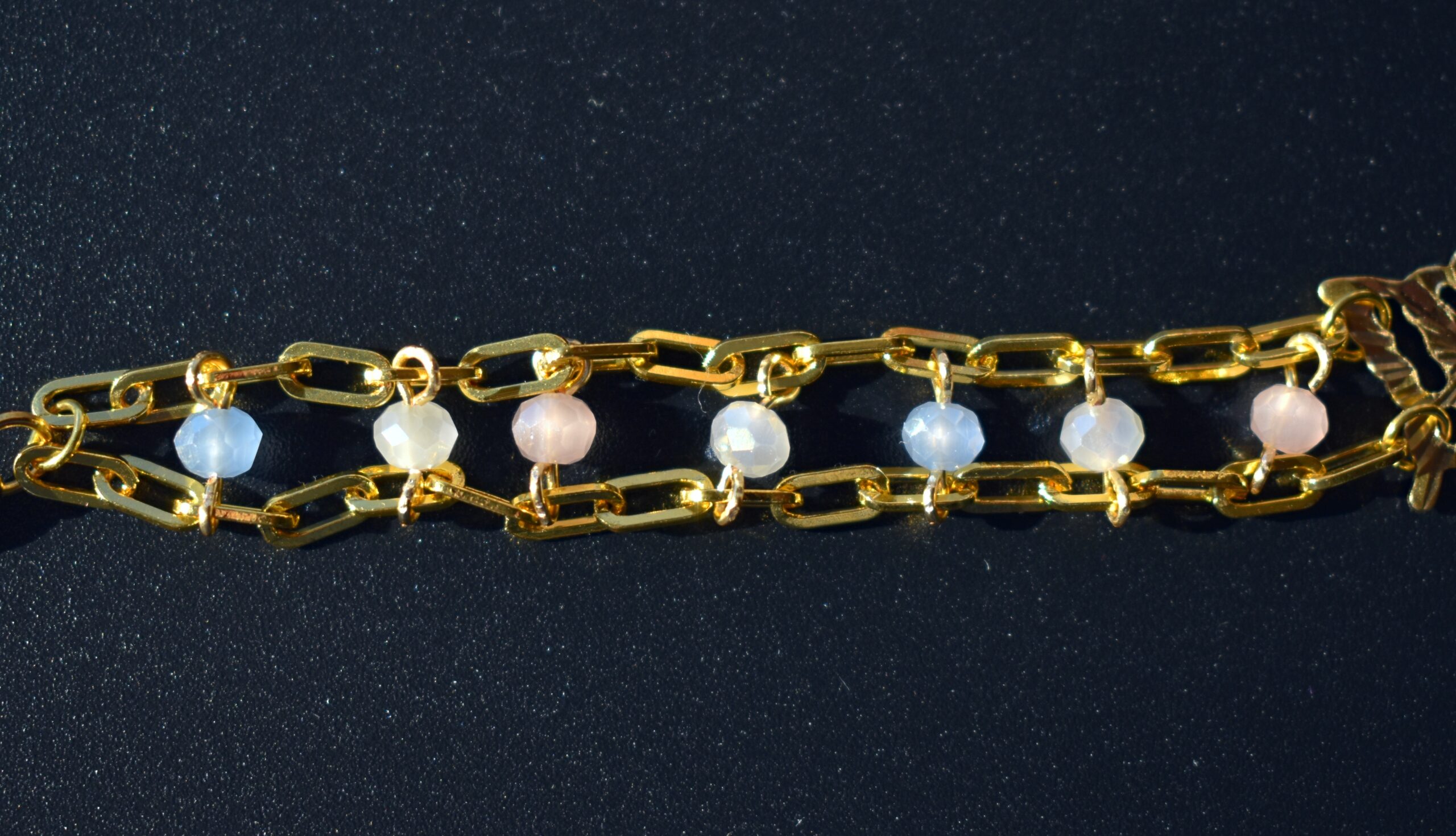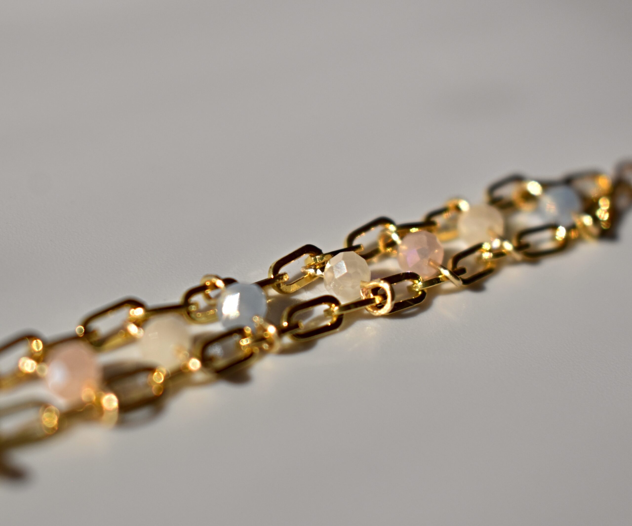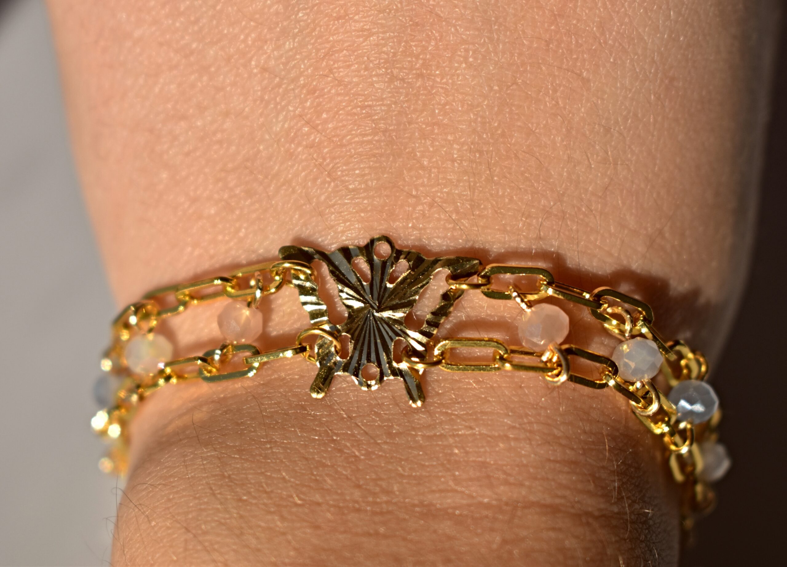 7 ” – 8″ Long gold double strand paperclip chain bracelet with gold butterfly charm in the center and white, pale pink, and pale blue crystal beads between the two chains.