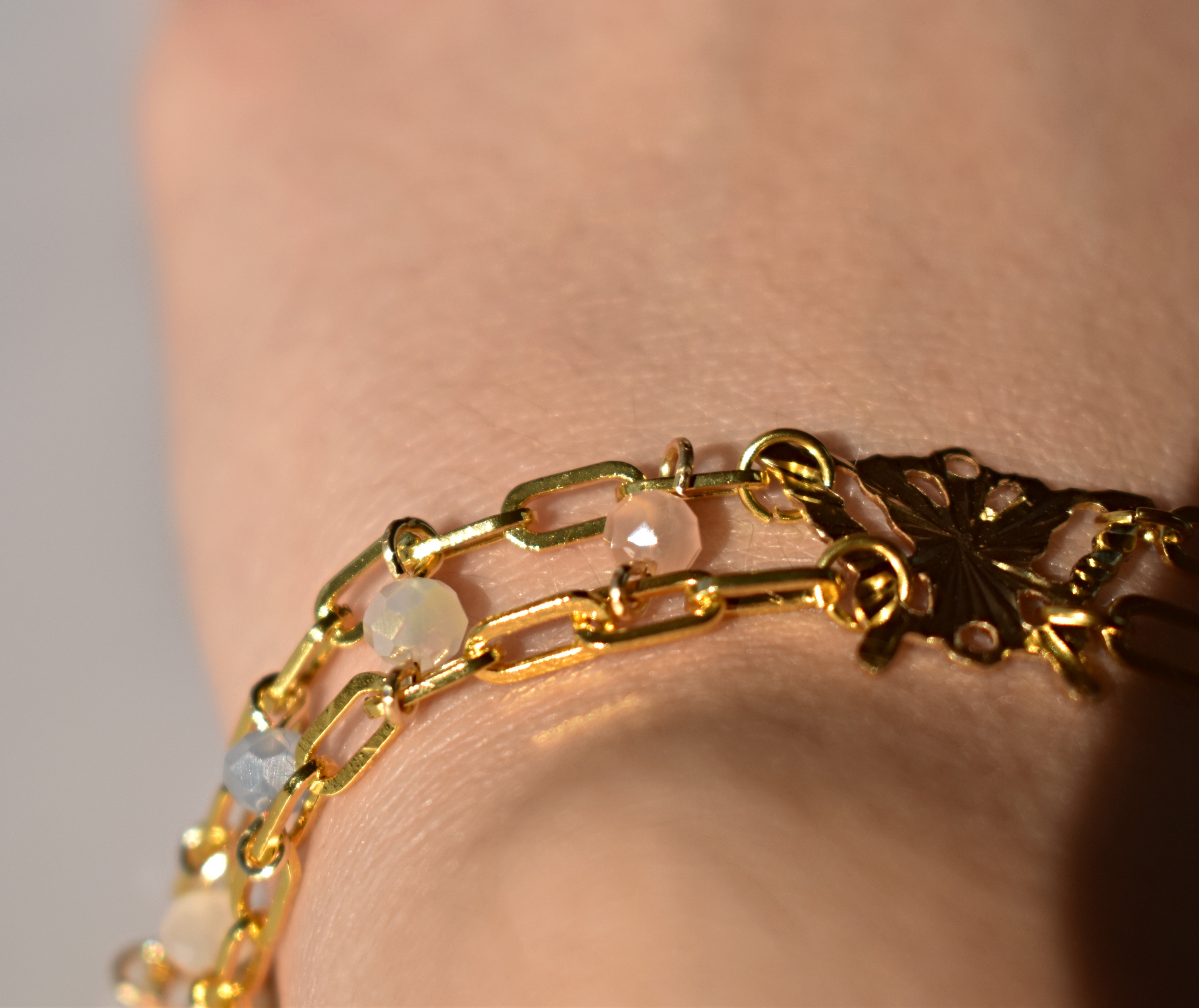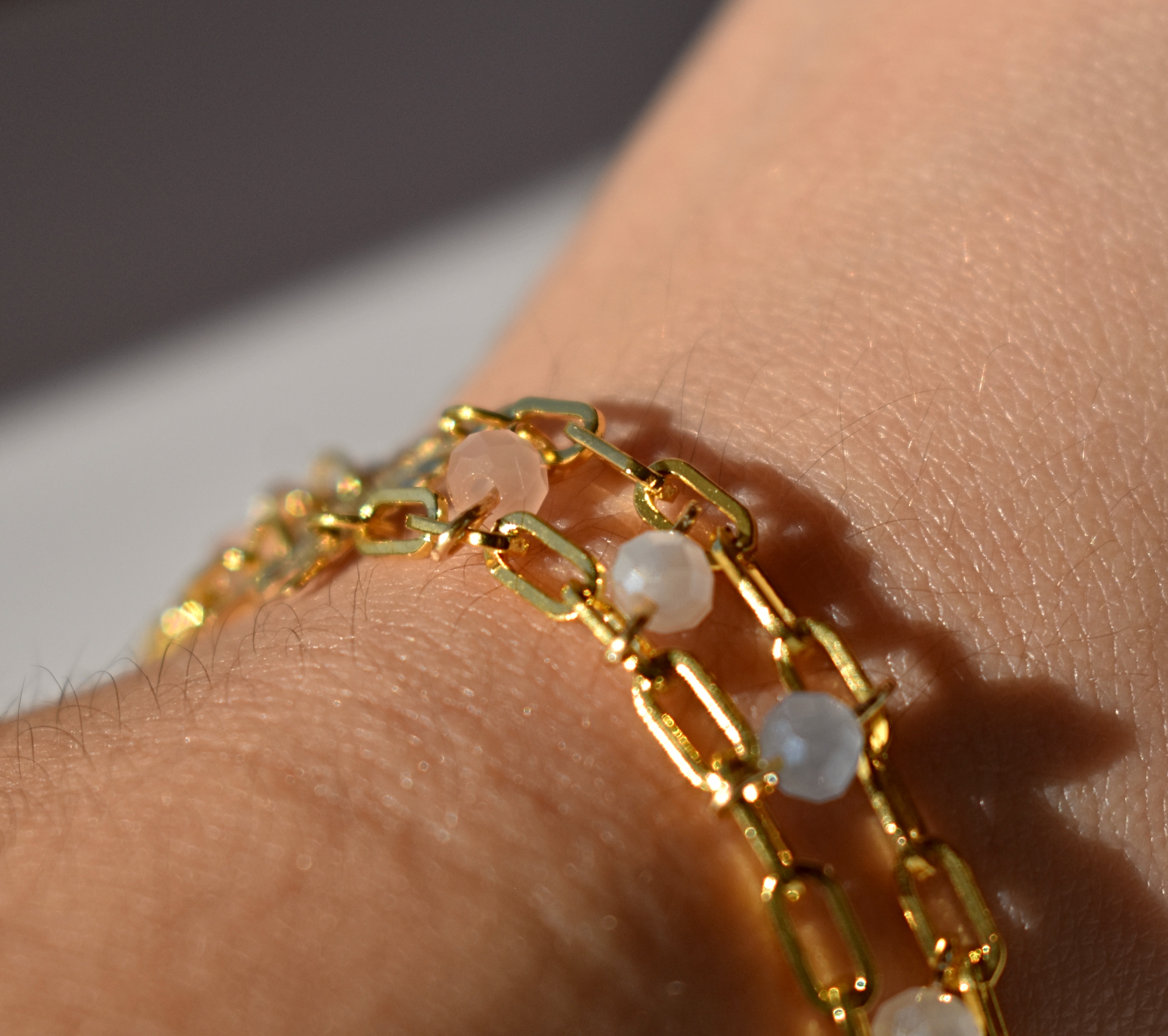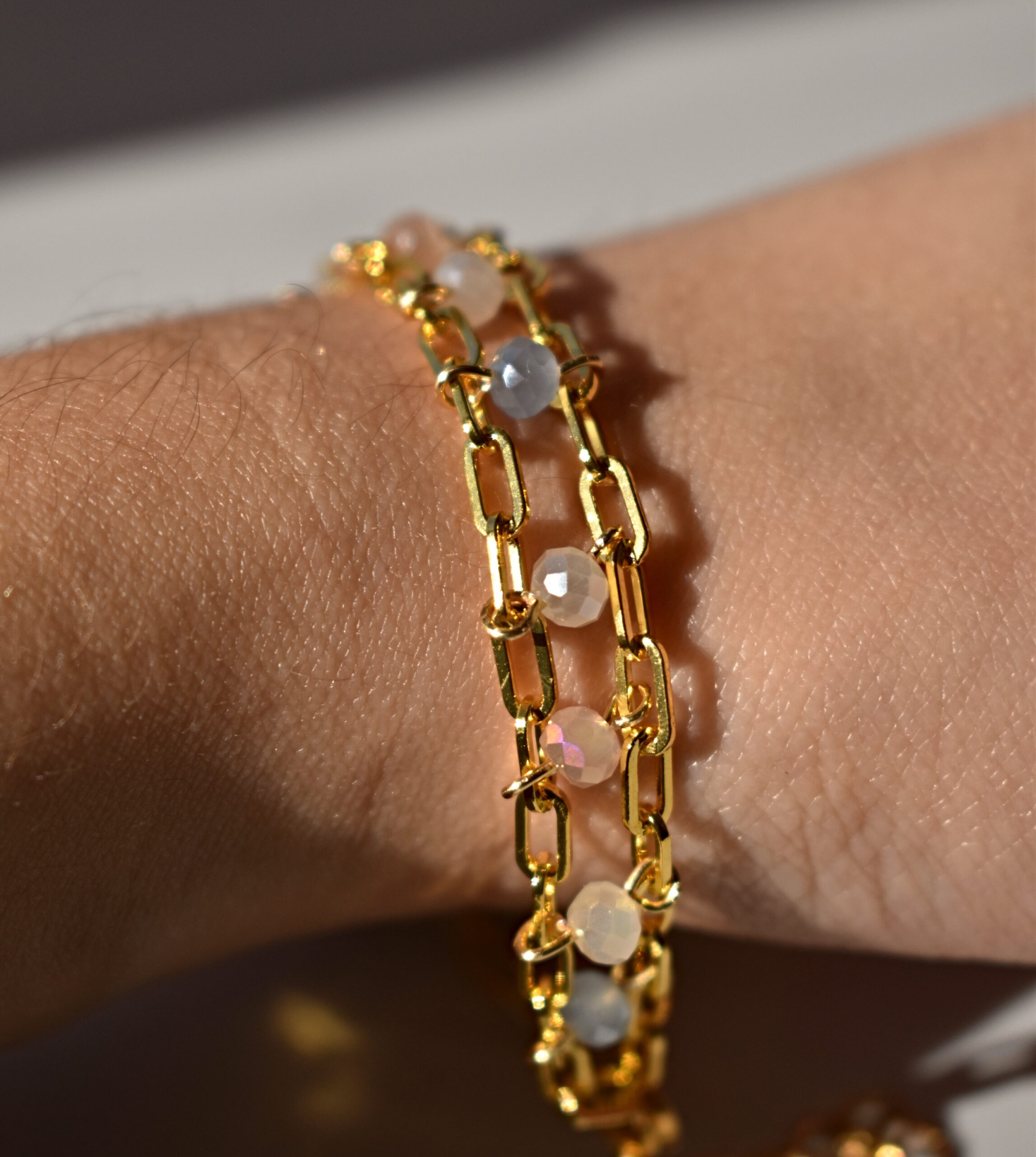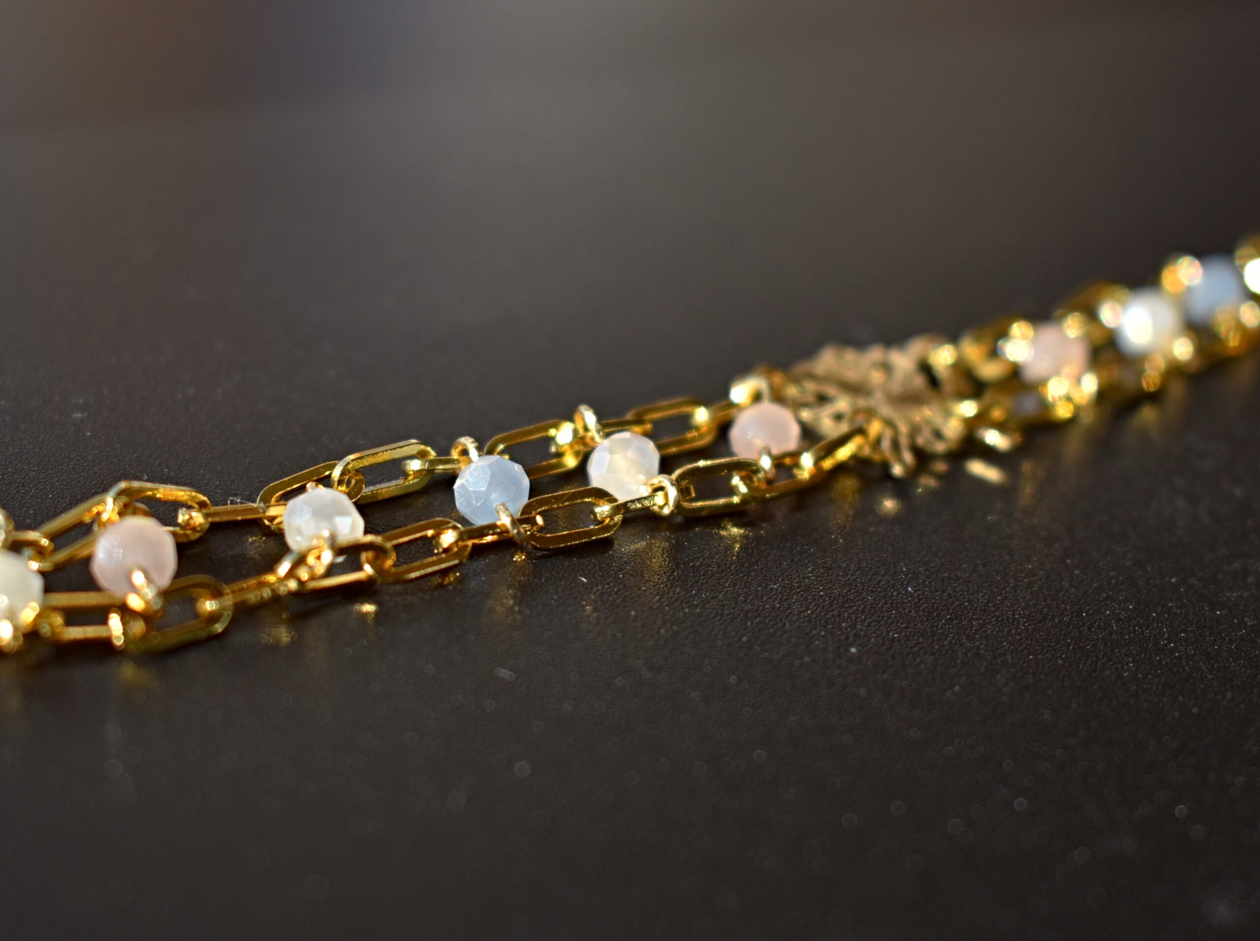 7 ” – 8″ Long gold double strand paperclip chain bracelet with gold butterfly charm in the center and white, pale pink, and pale blue crystal beads between the two chains.