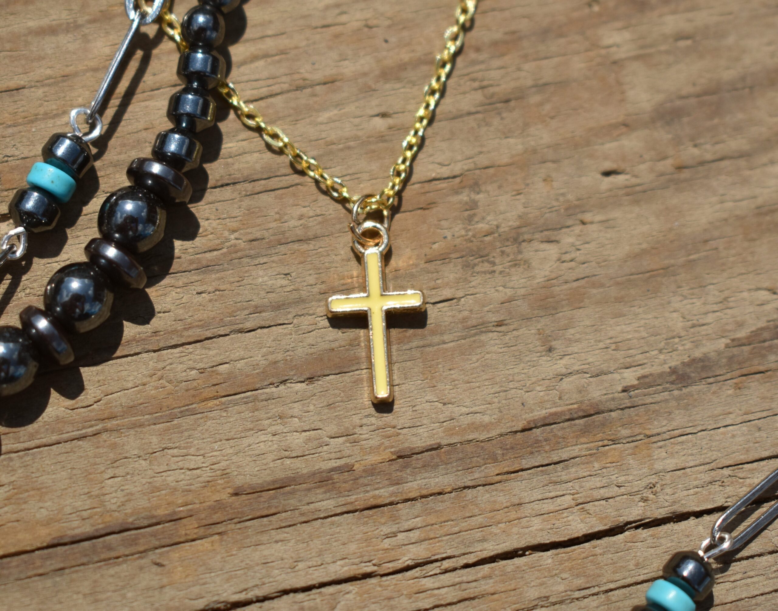 16 1/2″ Long gold necklace with gold and yellow cross charm and yellow beads throughout the chain.