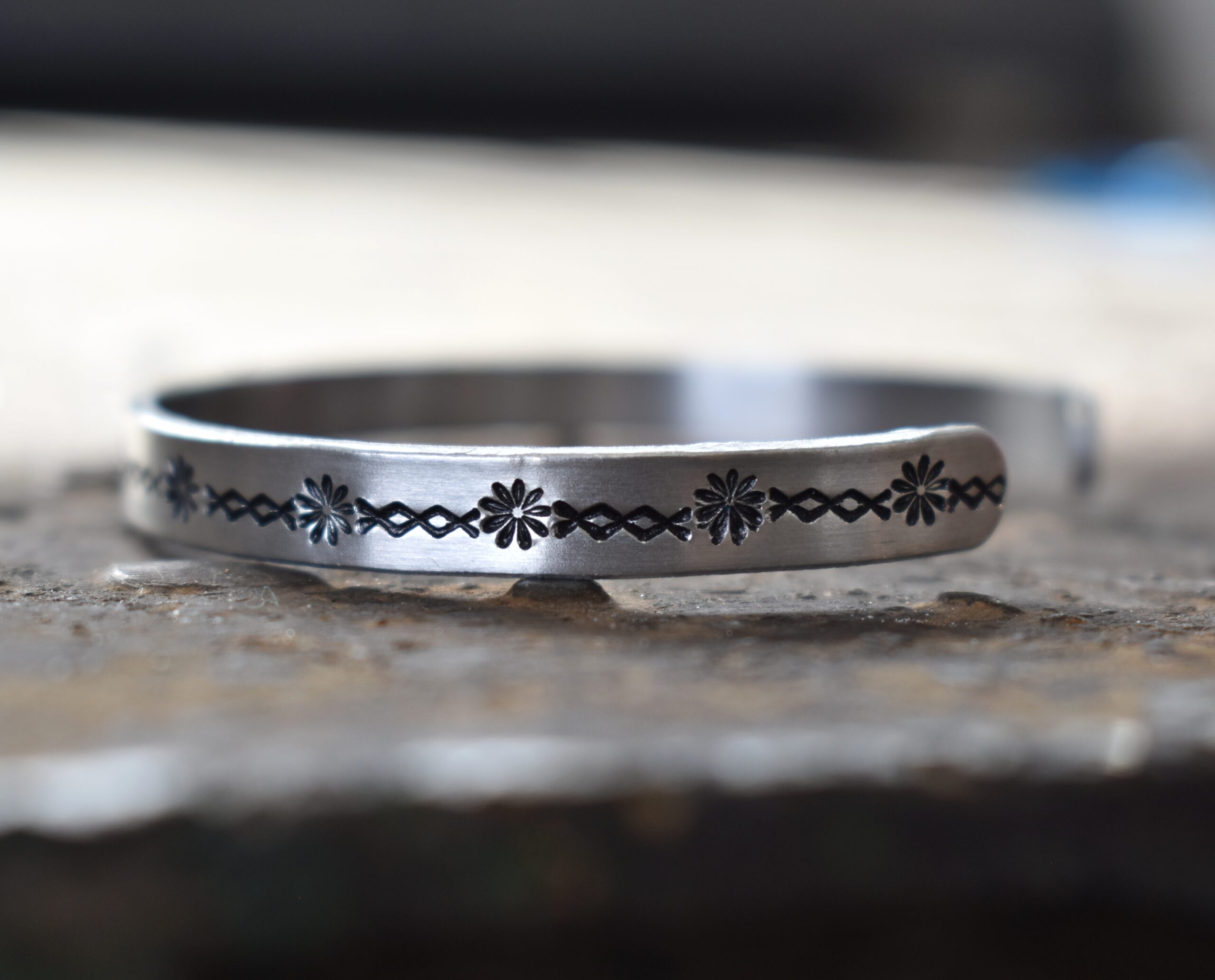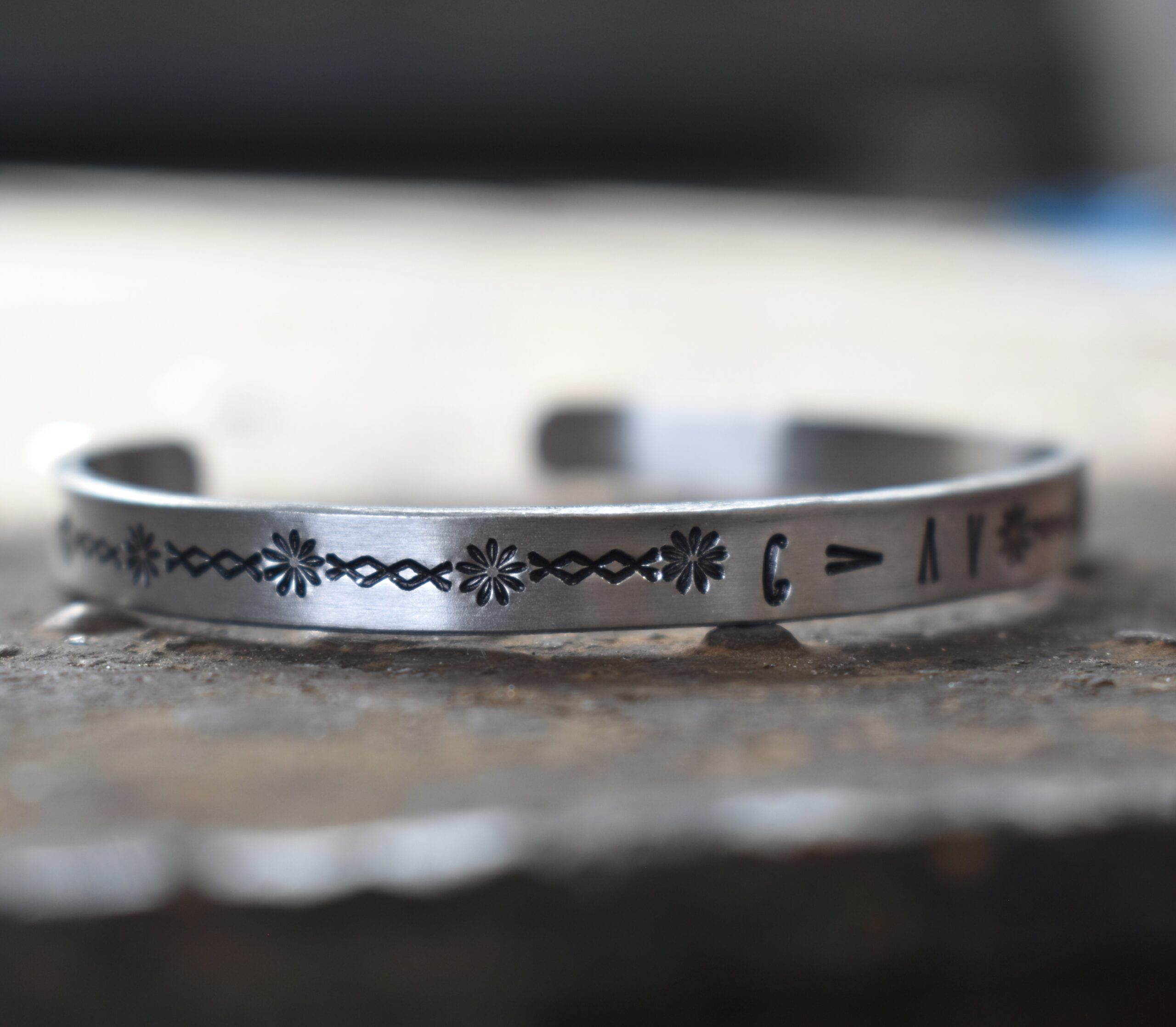 Adjustable metal stamp bracelet with G > /\ \/ in the center and a flower line pattern on each side.
