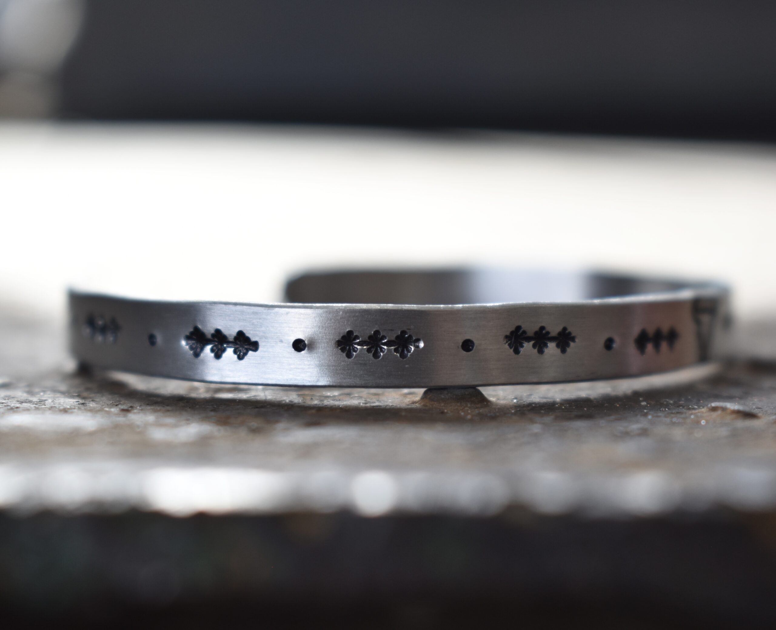 Adjustable metal stamp bracelet with longhorn in the center and western line pattern on each side.