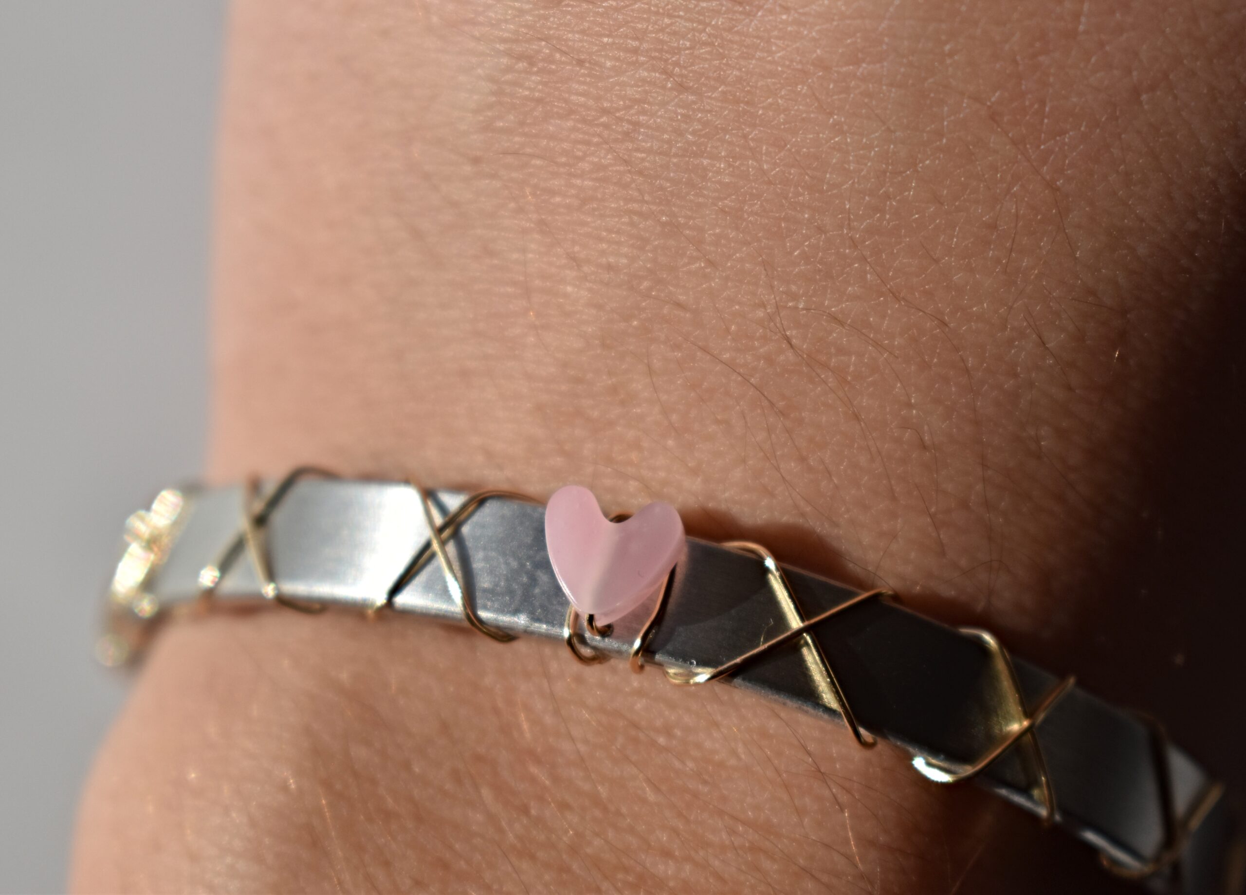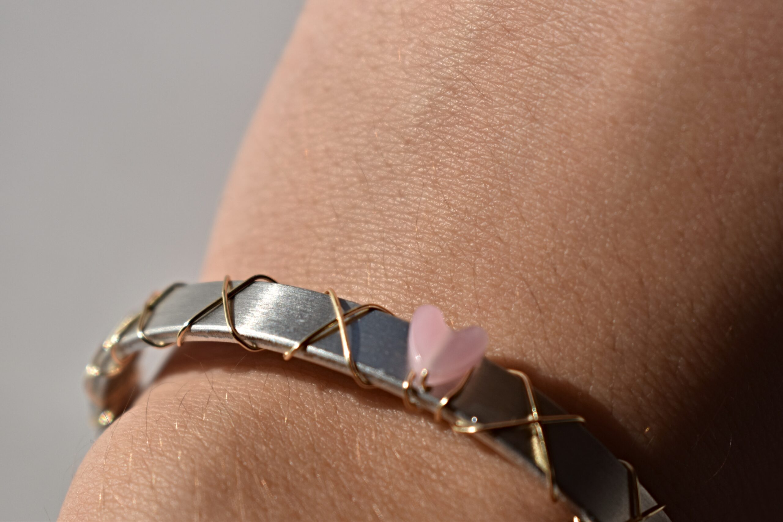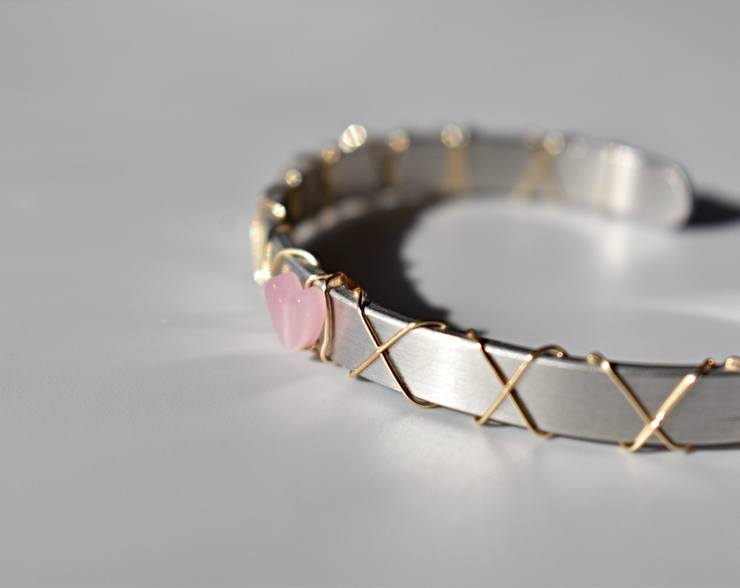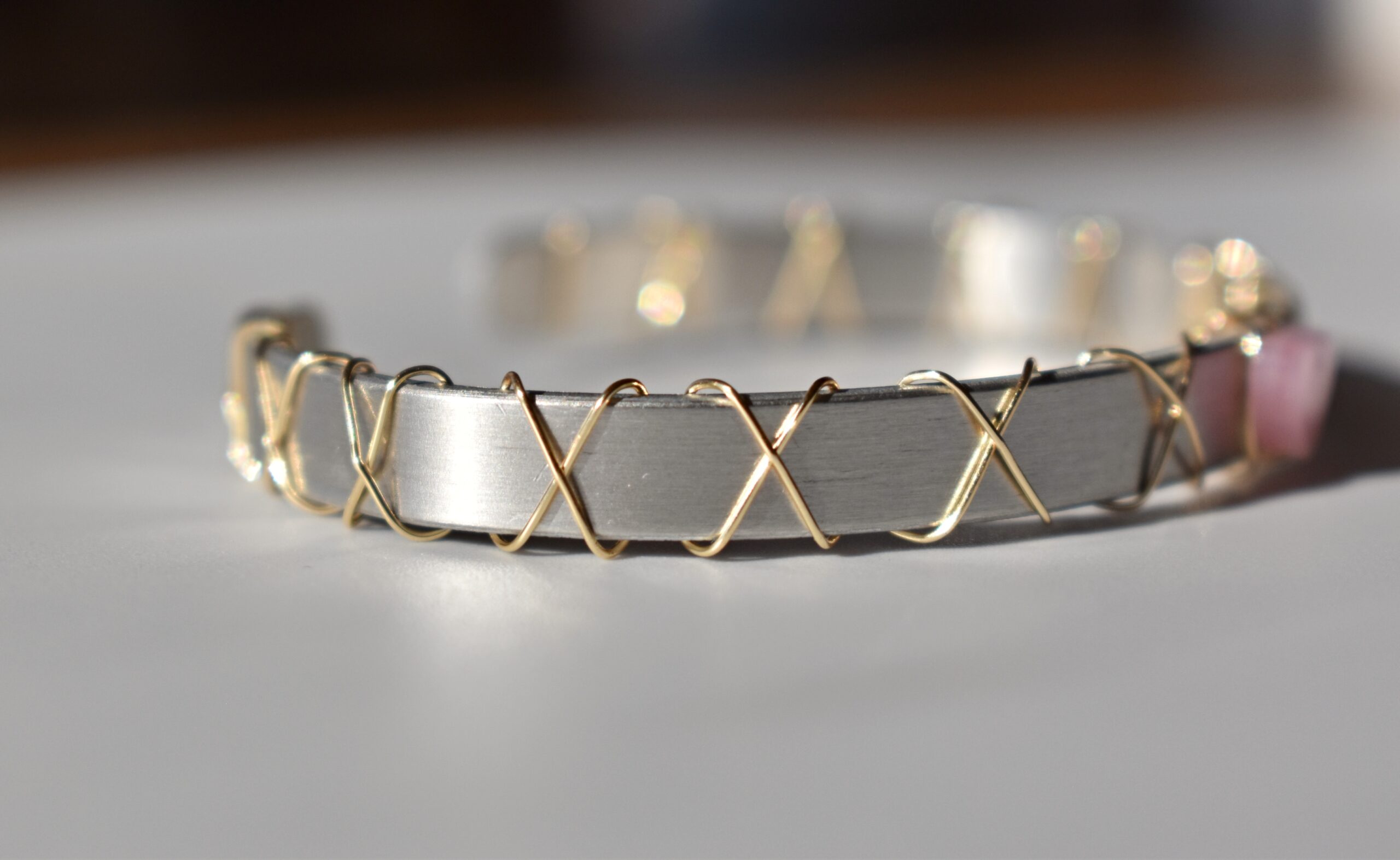 Adjustable silver cuff bracelet with pink stone bead with gold wire intertwined around it.