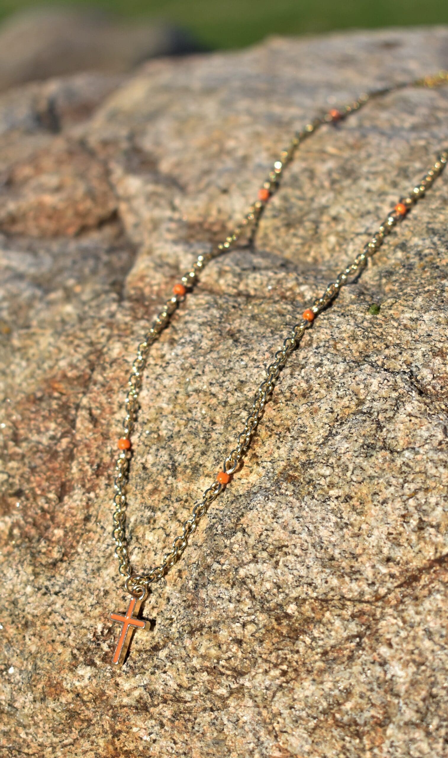 16 3/4″ – 17 1/2″ Long gold chain necklace with an orange and gold cross charm. The chain has orange beads throughout it.