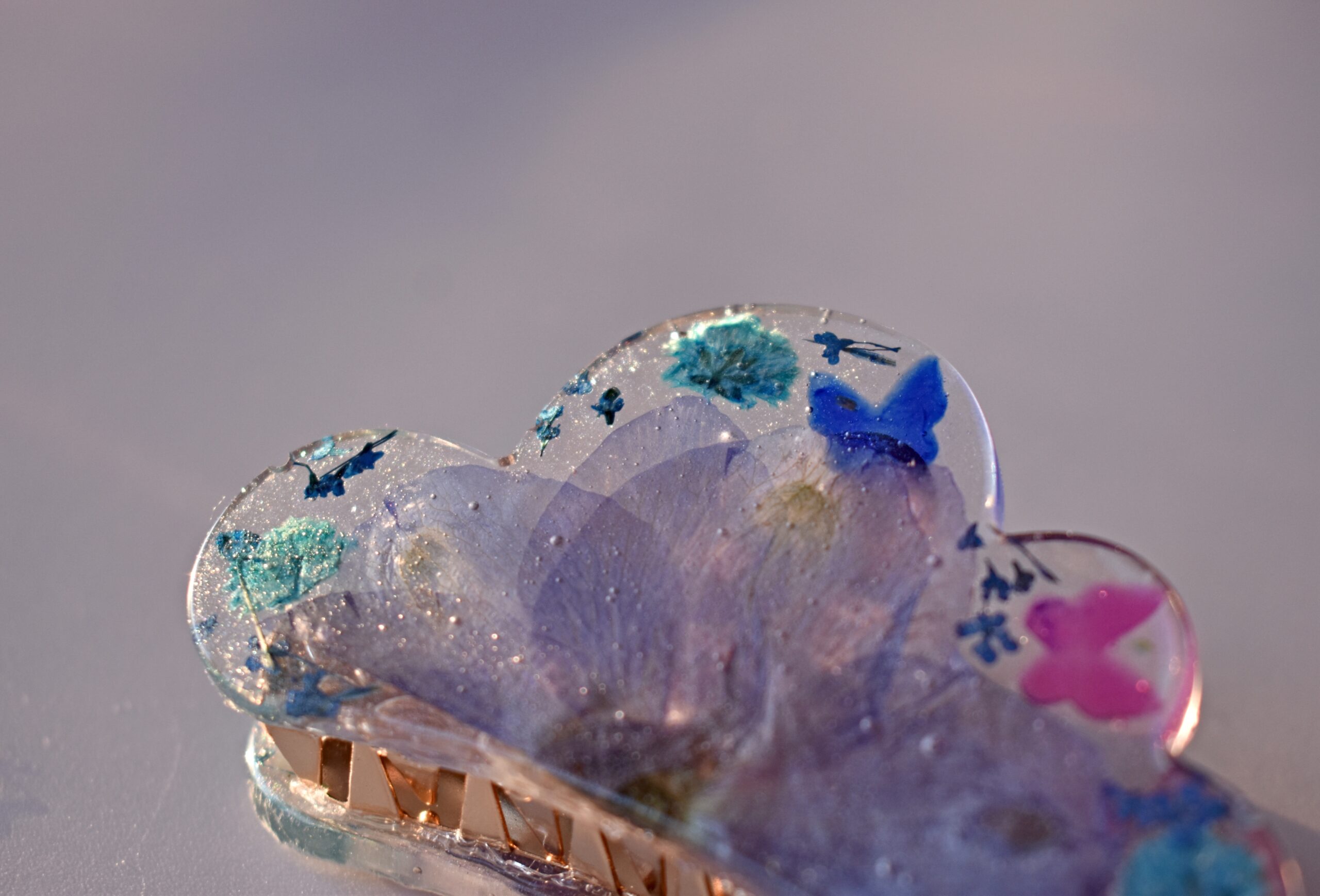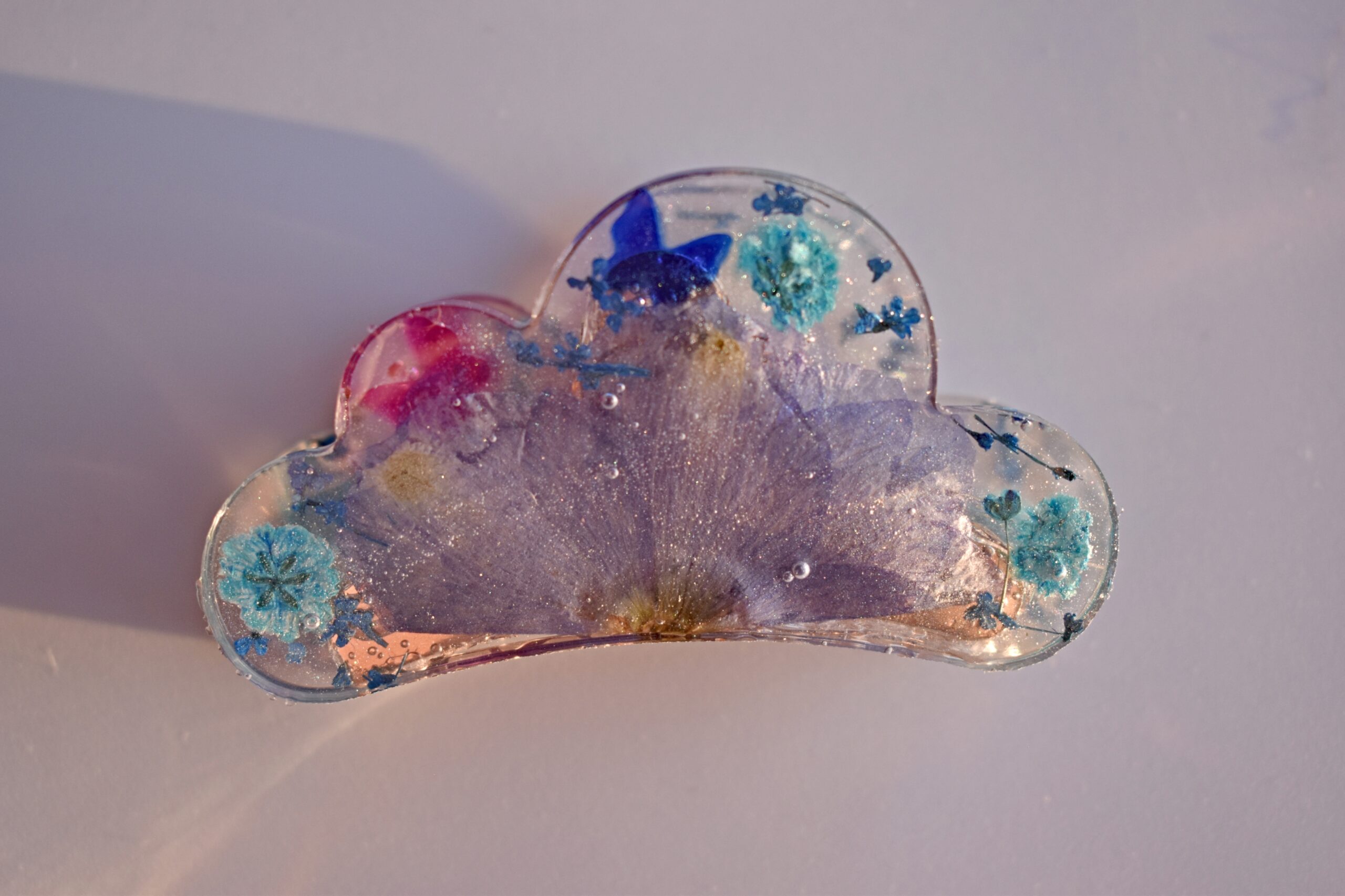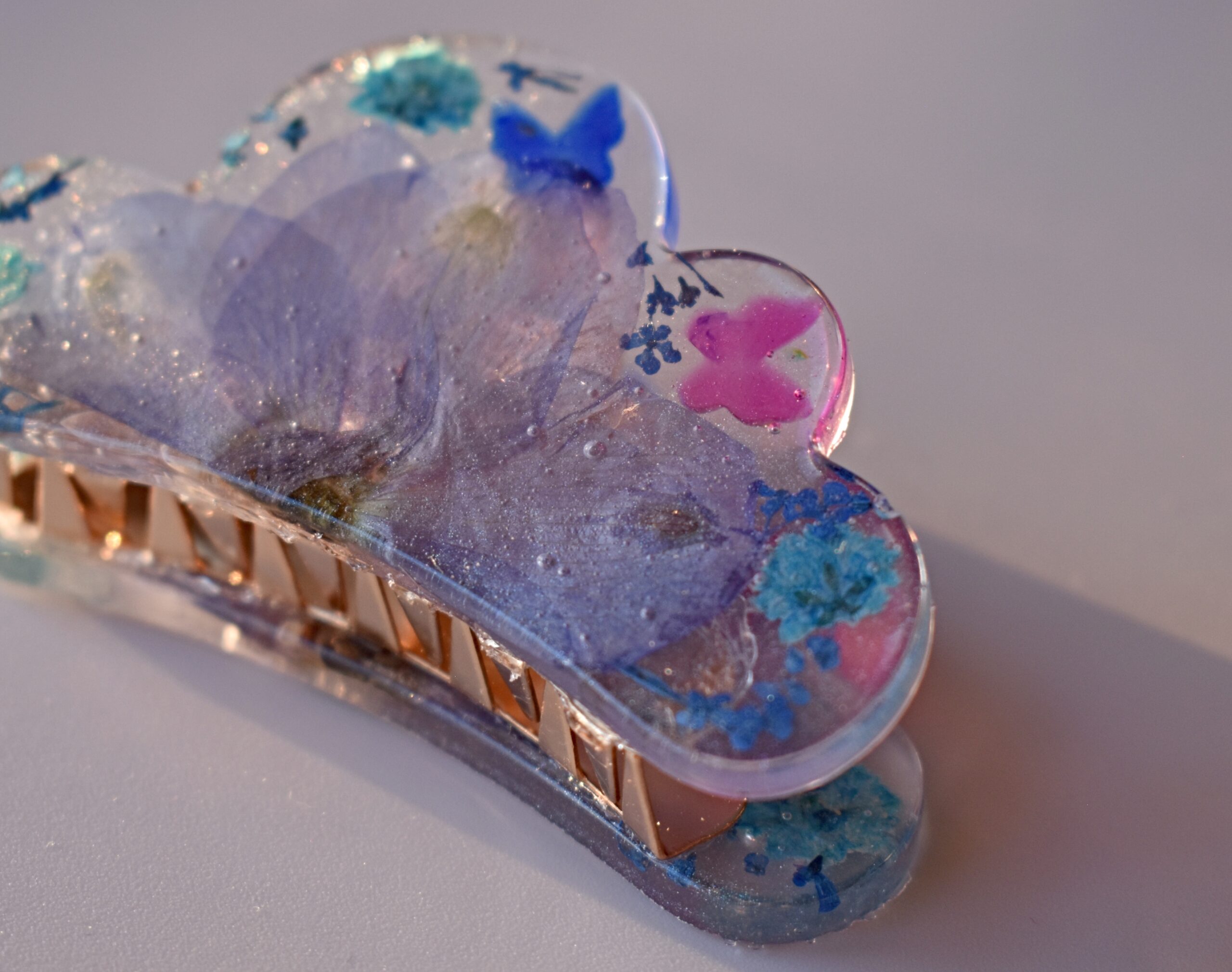 2 1/2″ Cloud resin claw clip with periwinkle and blue flowers and pink and blue butterfly’s.