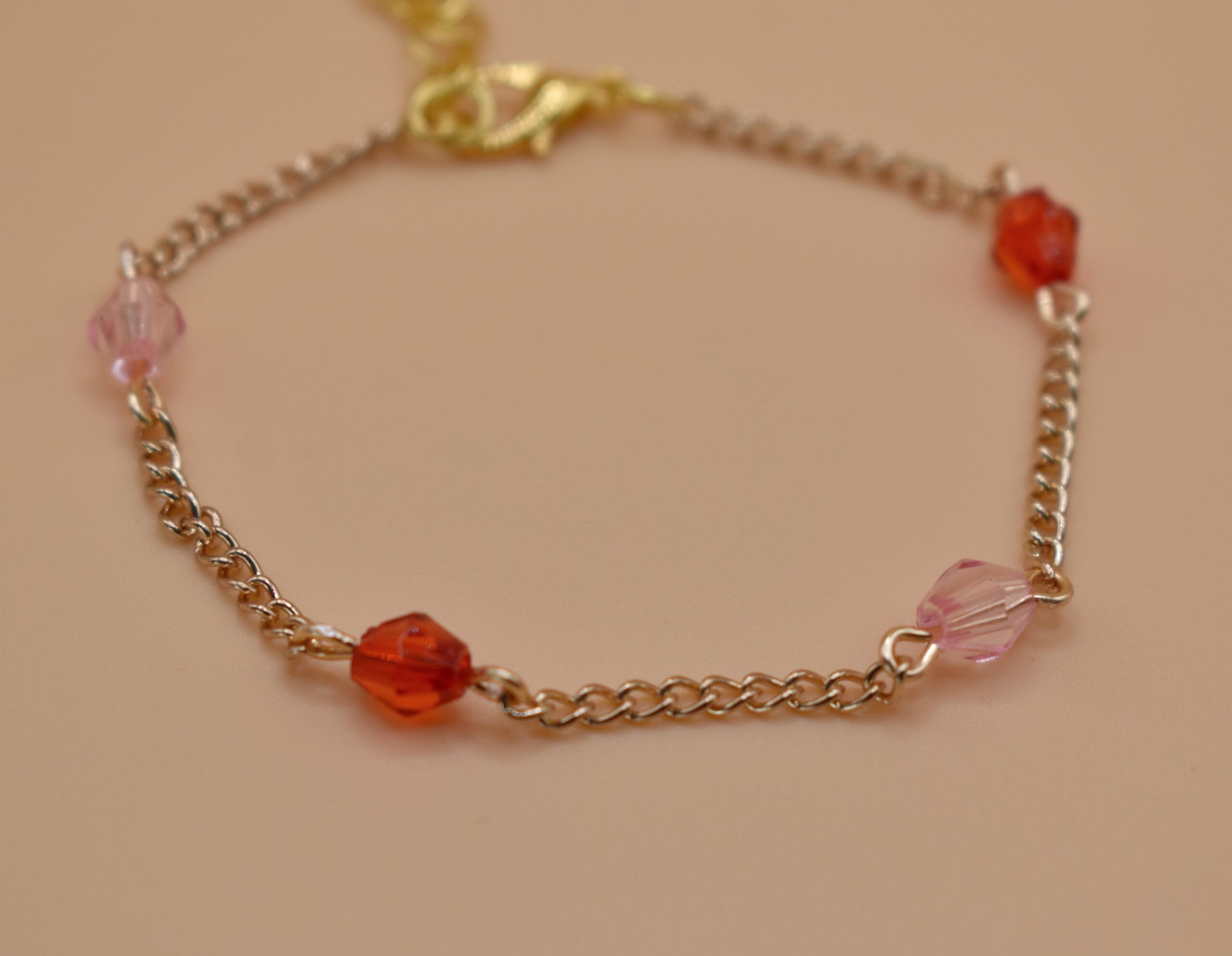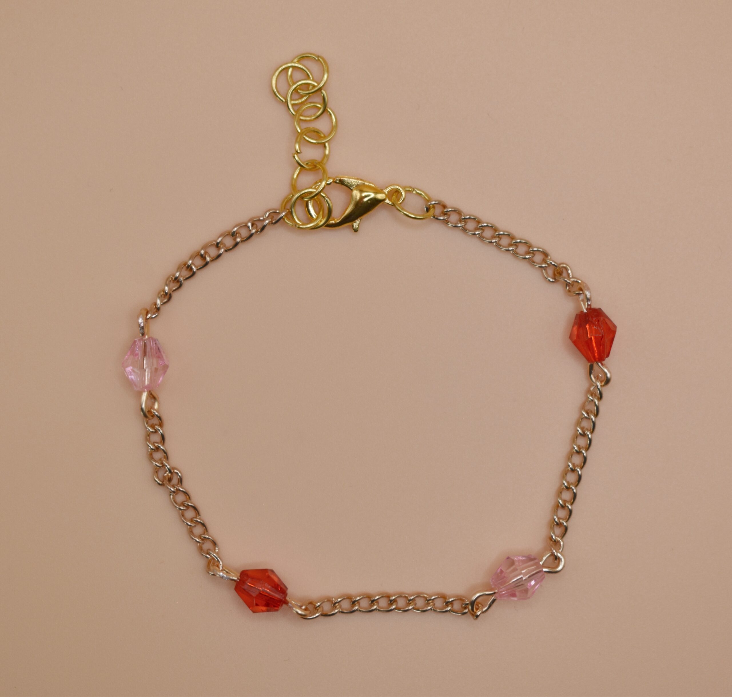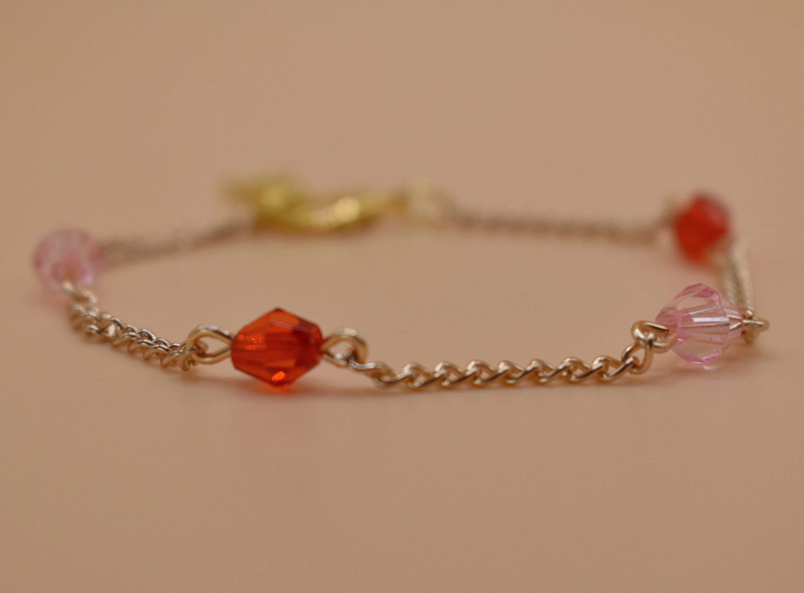 7 – 8 1/3 in. long bracelet with pink and red beads.