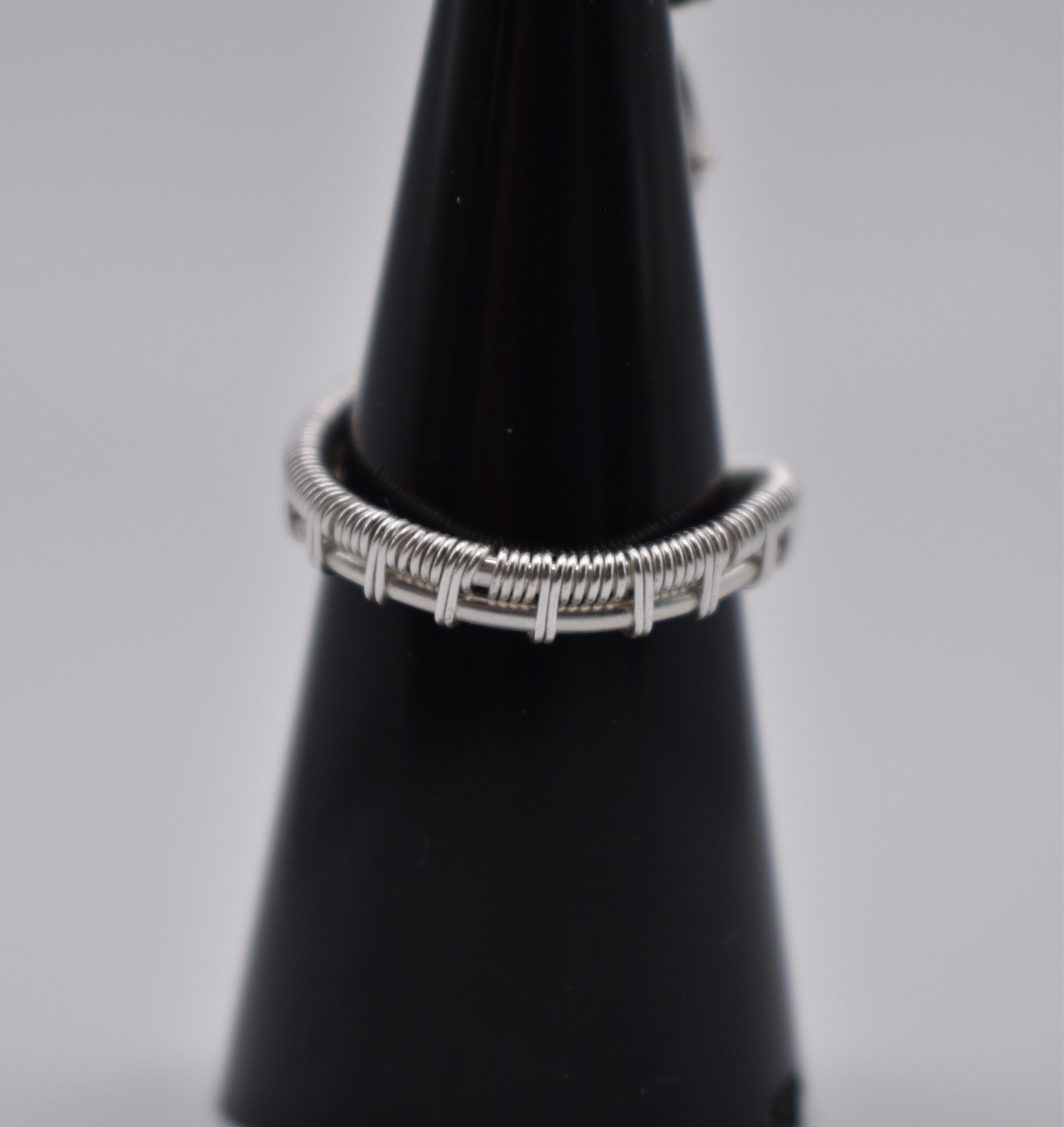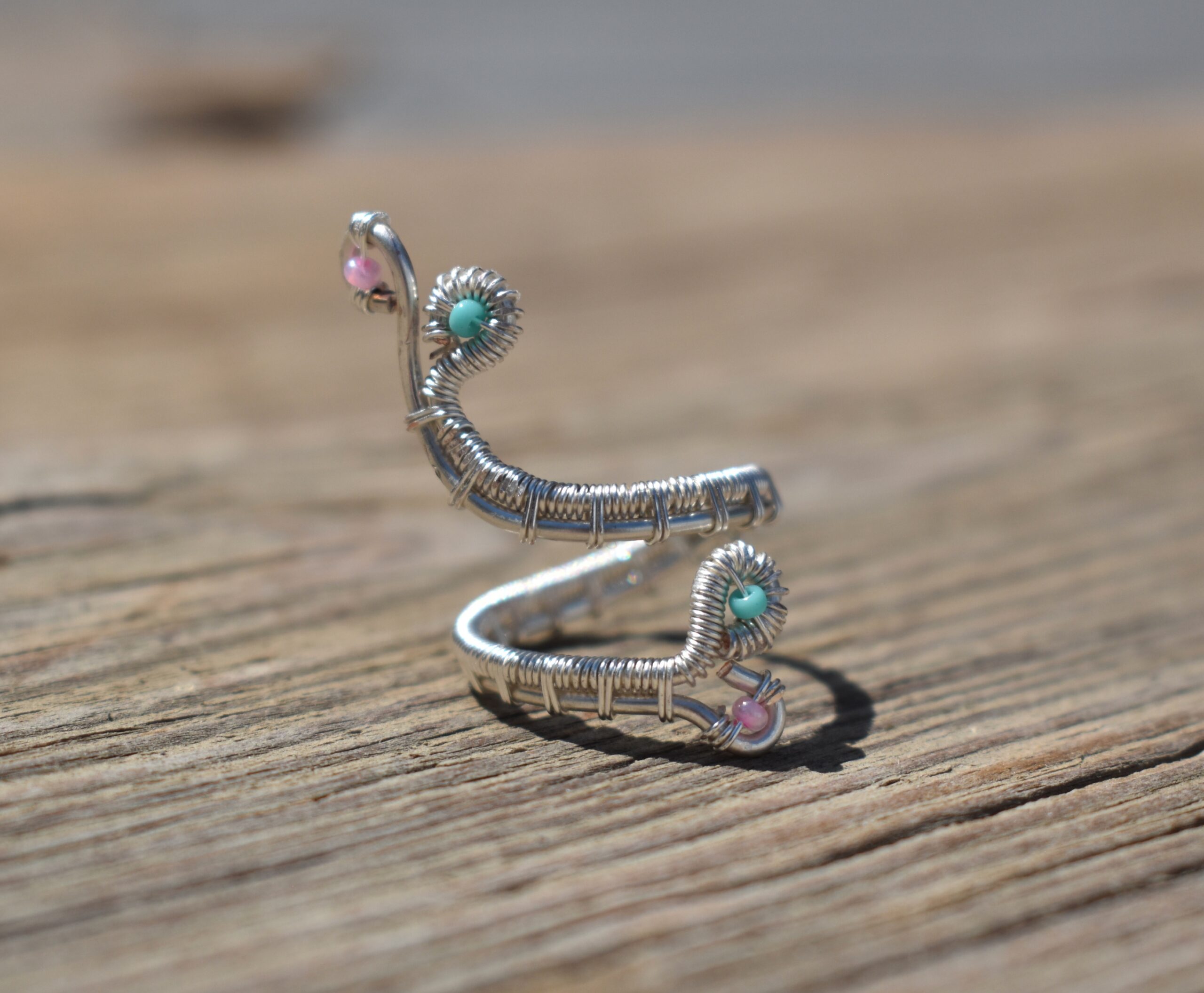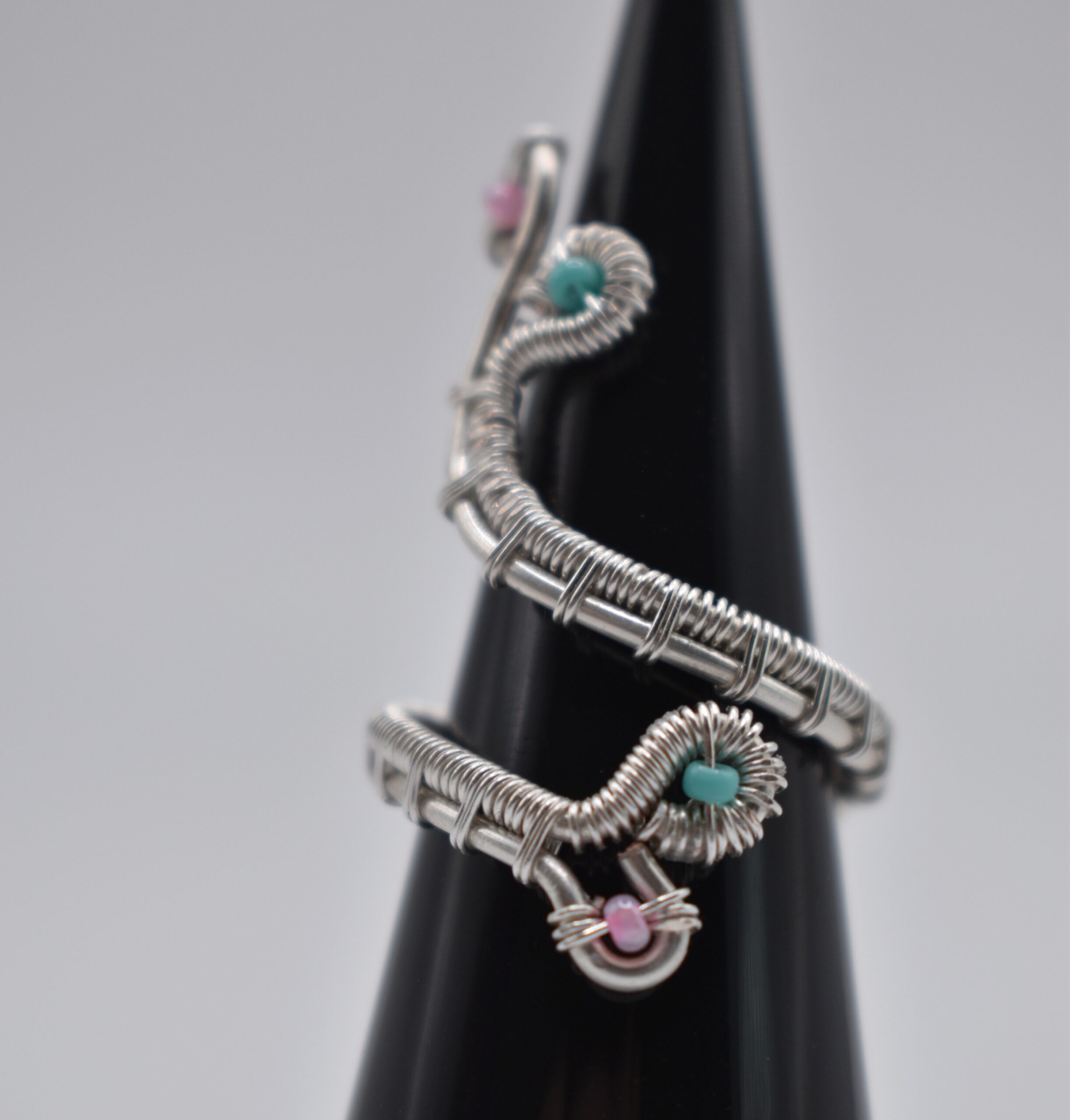 Silver wire wrapped adjustable ring with pink and teal beads.