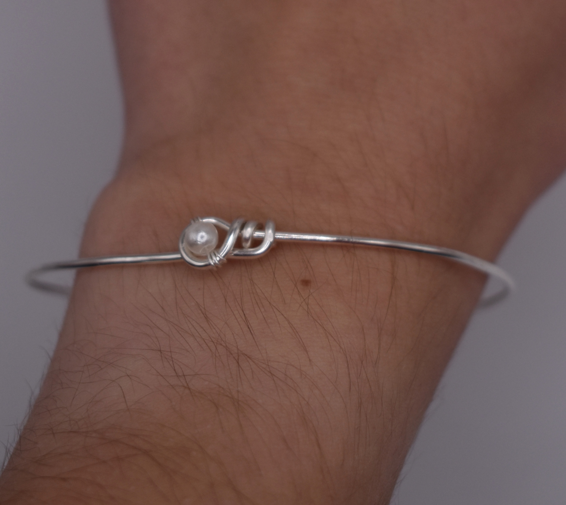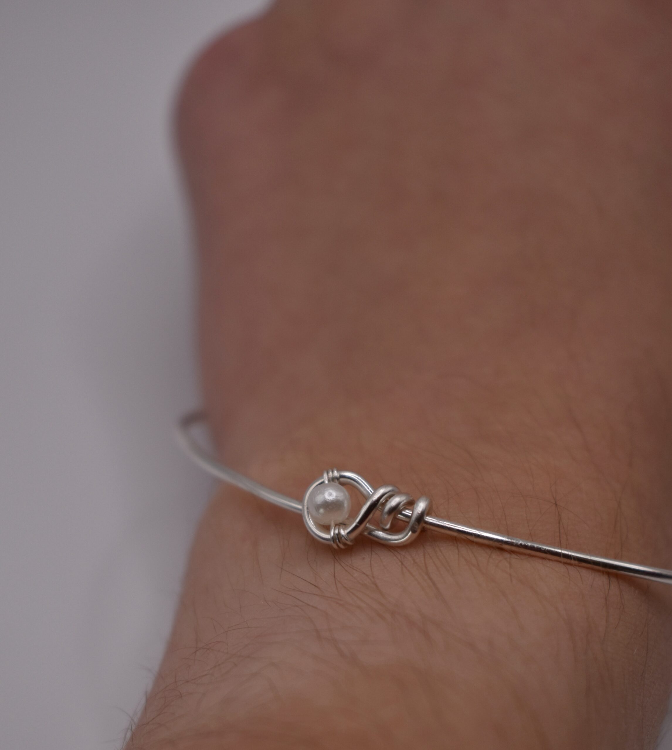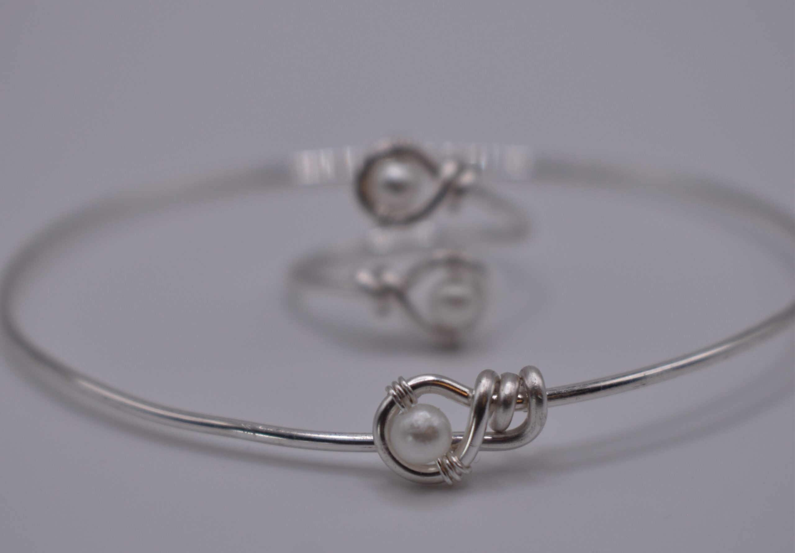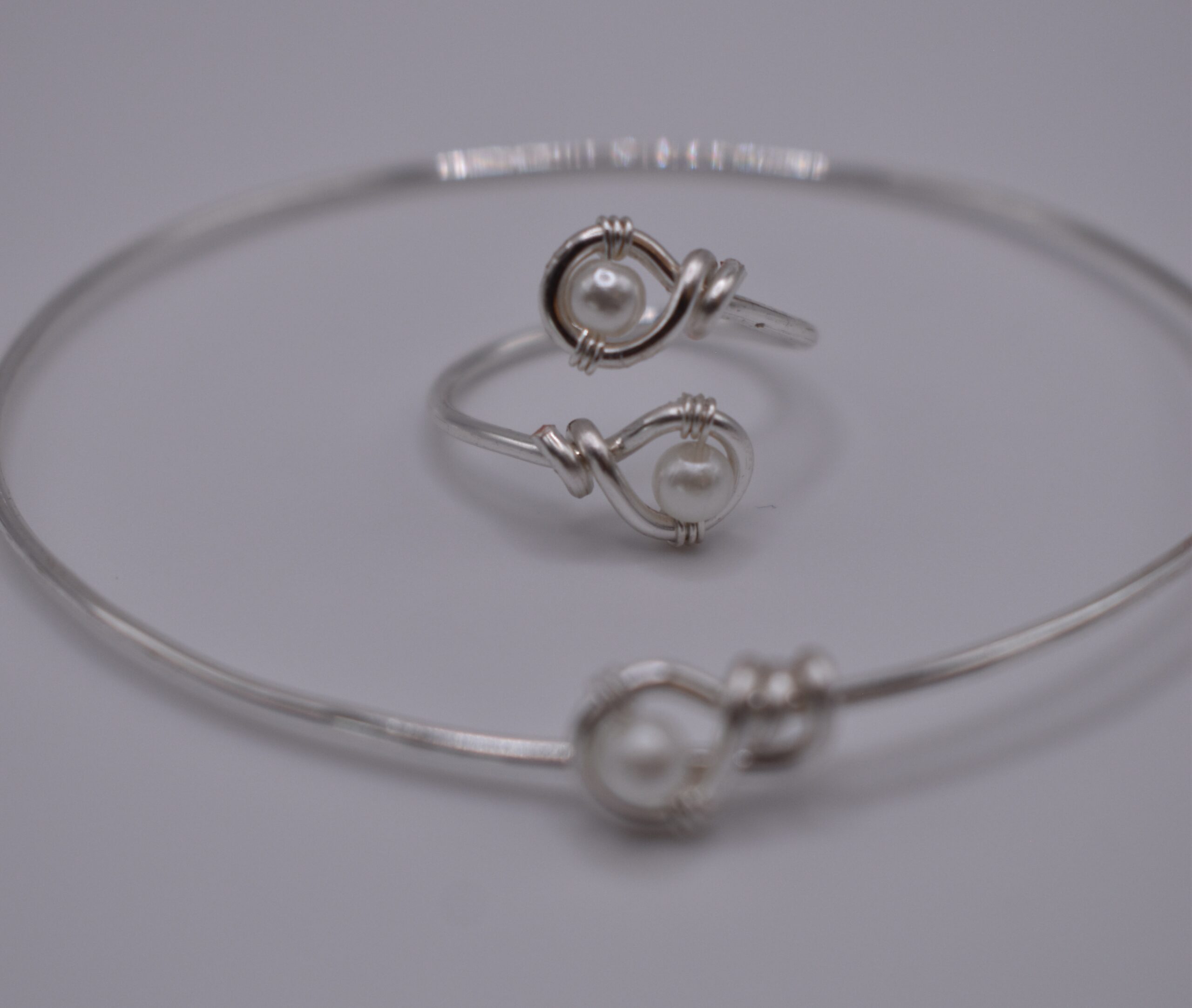 Adjustable silver wire ring and bracelet with pearl beads. Bracelet is 8 1/2 in. Ring is *pictured at a size 7 but adjustable to be bigger or smaller.*