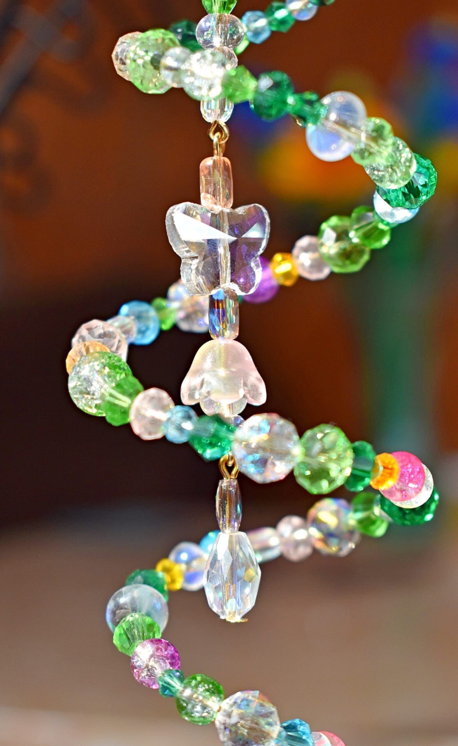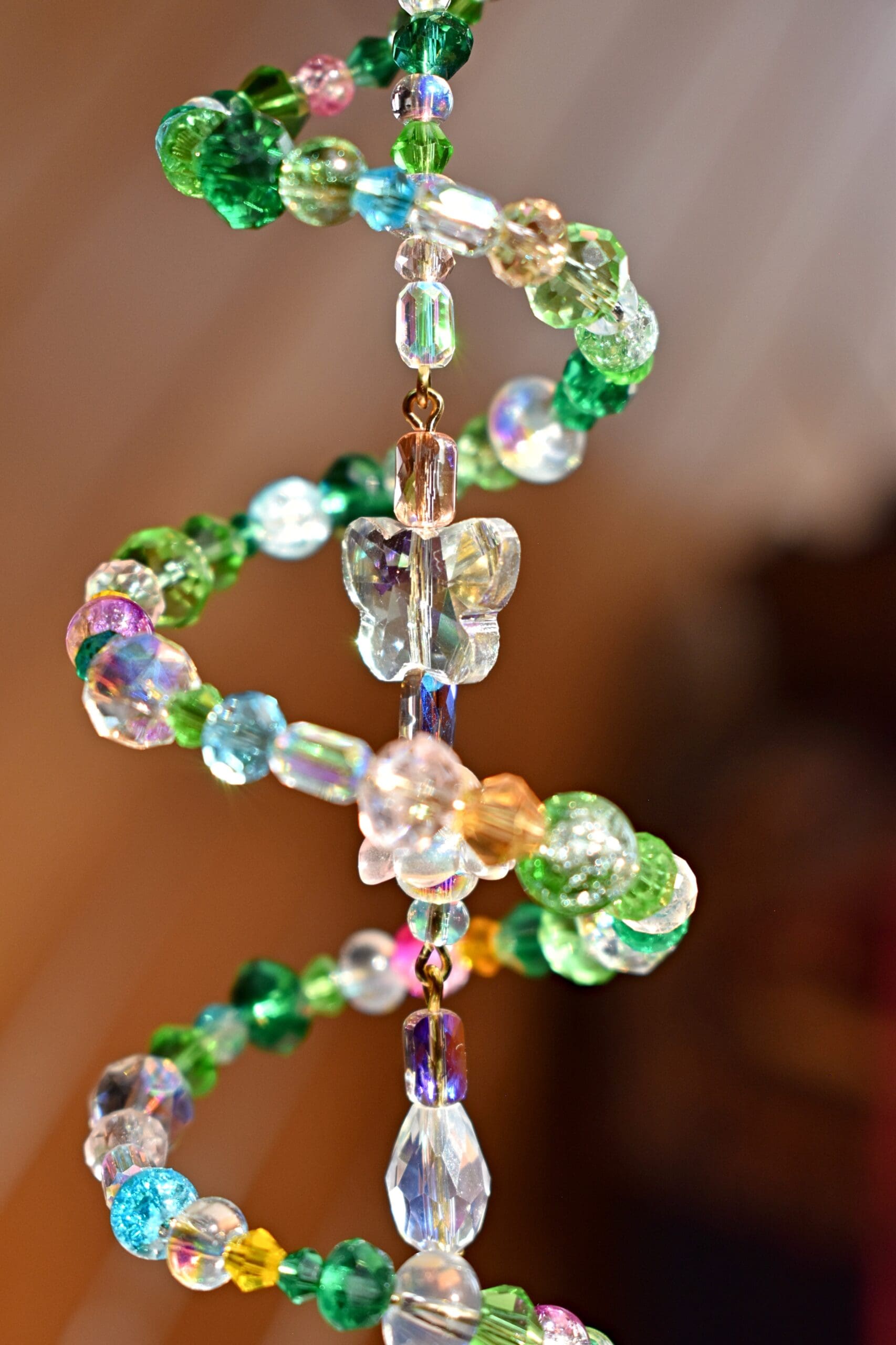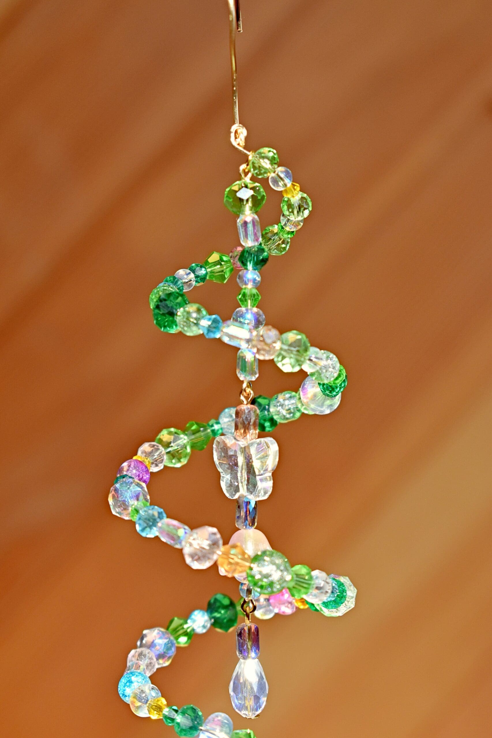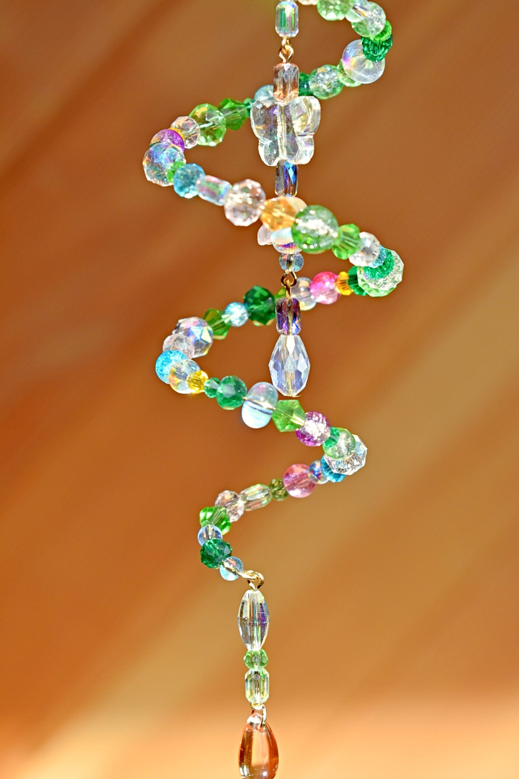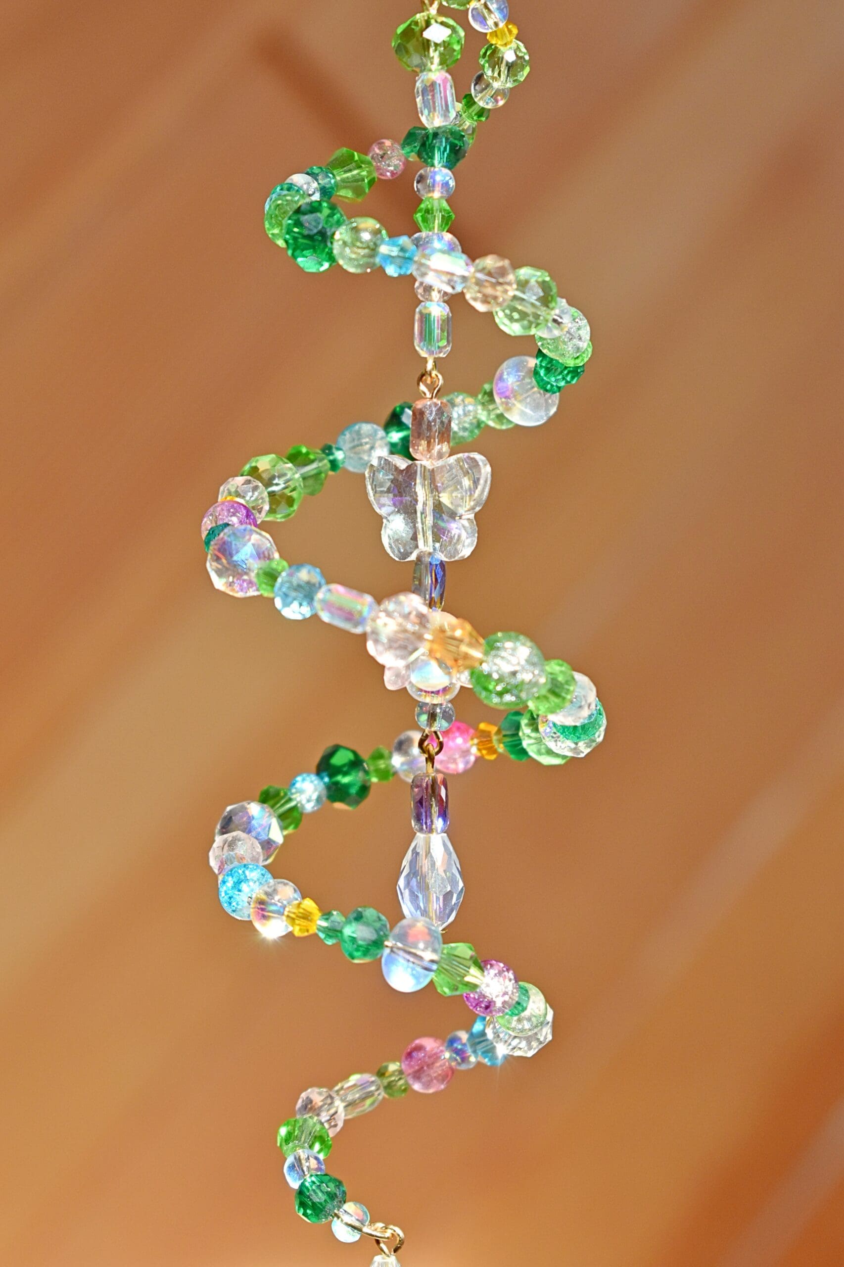 9 in. Long beaded wire sun catcher in a spiral shape with a butterfly, flower teardrop strand in the middle.