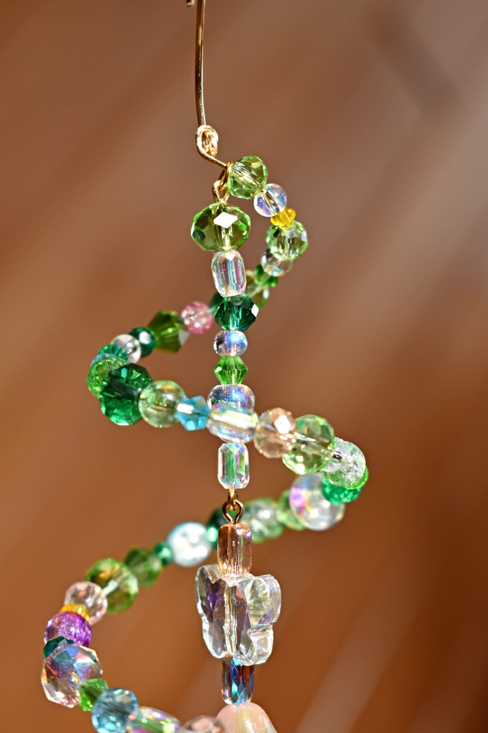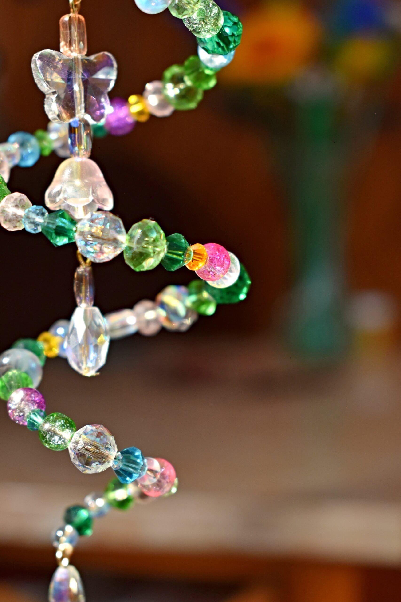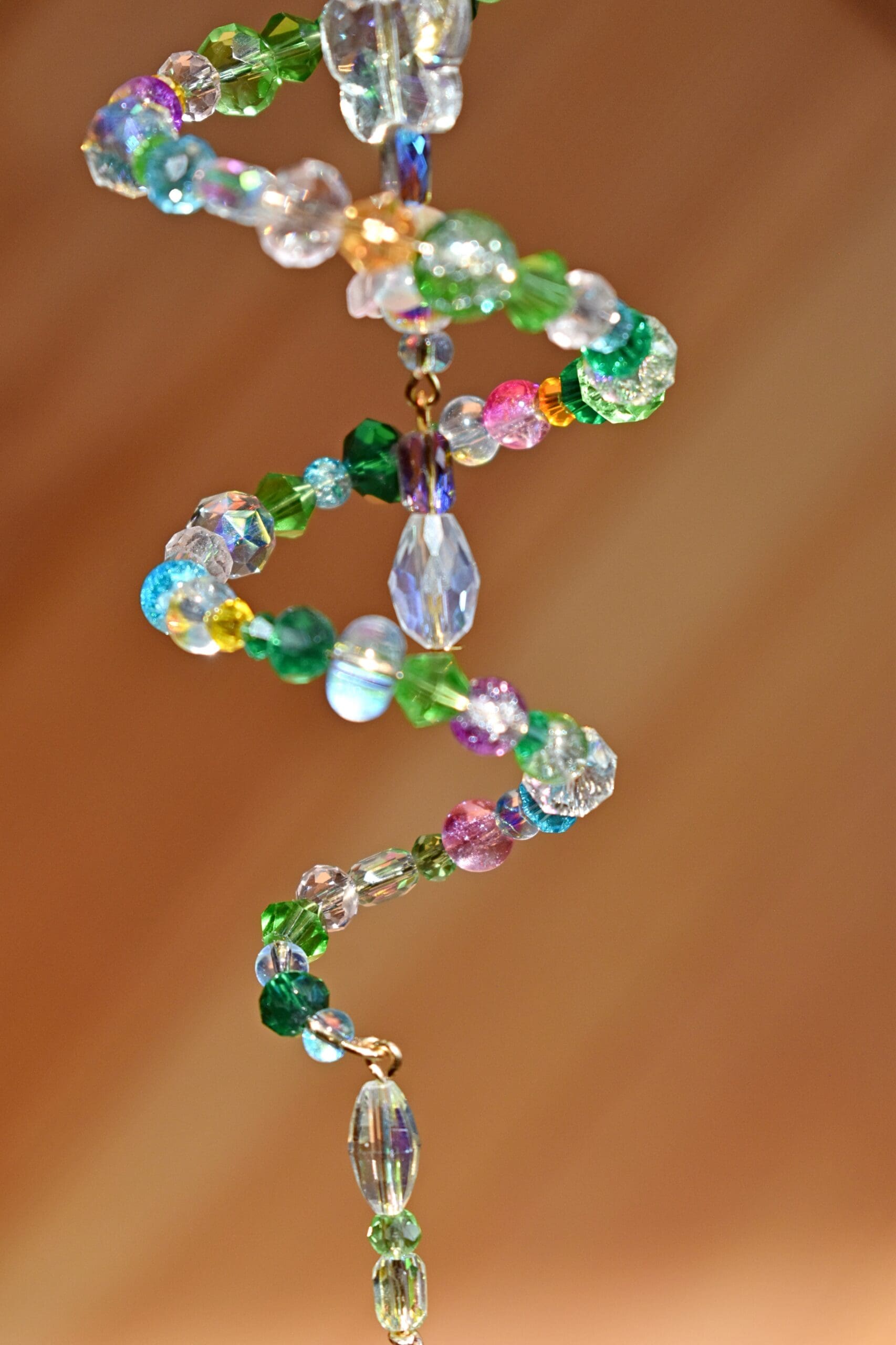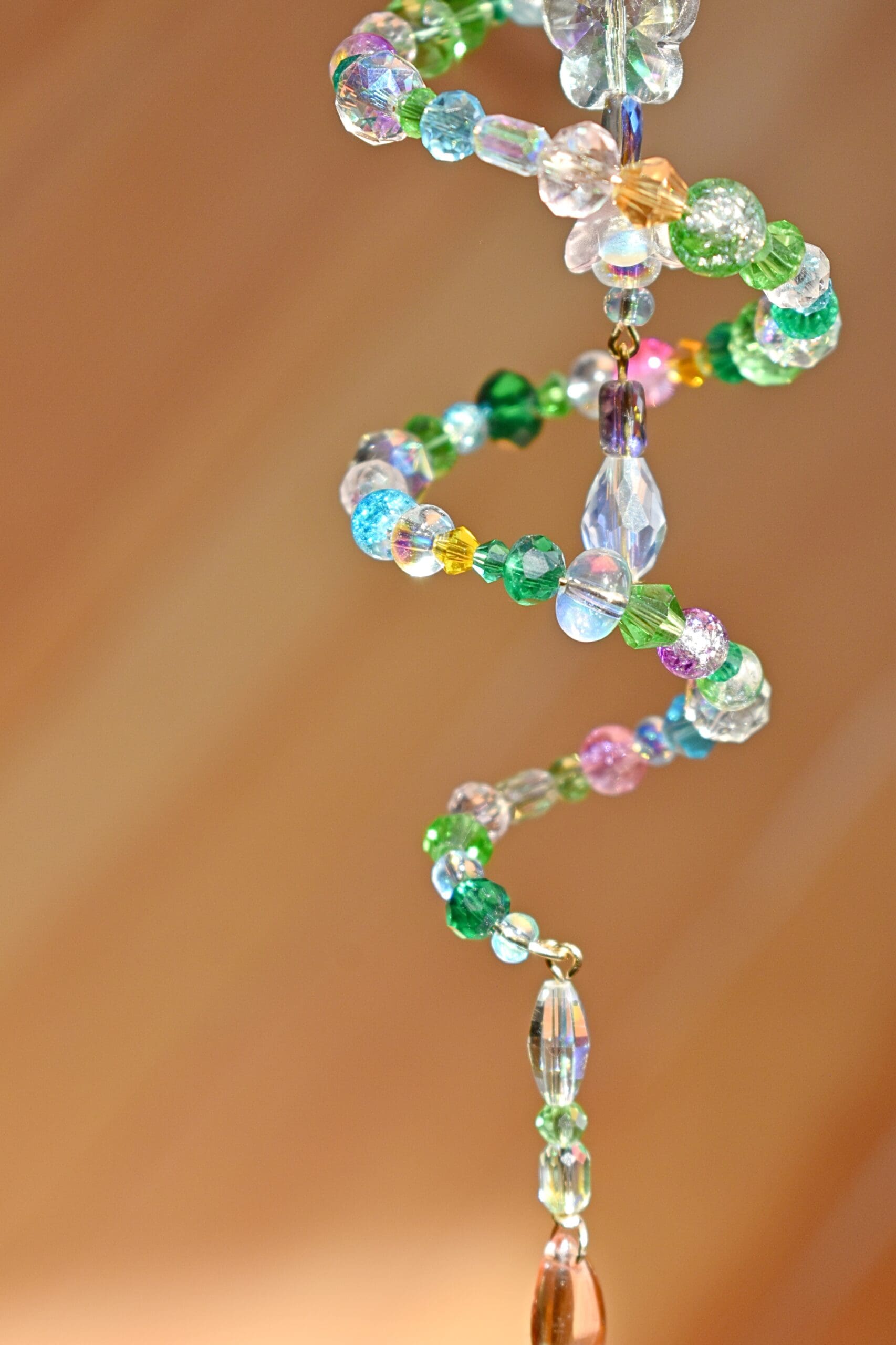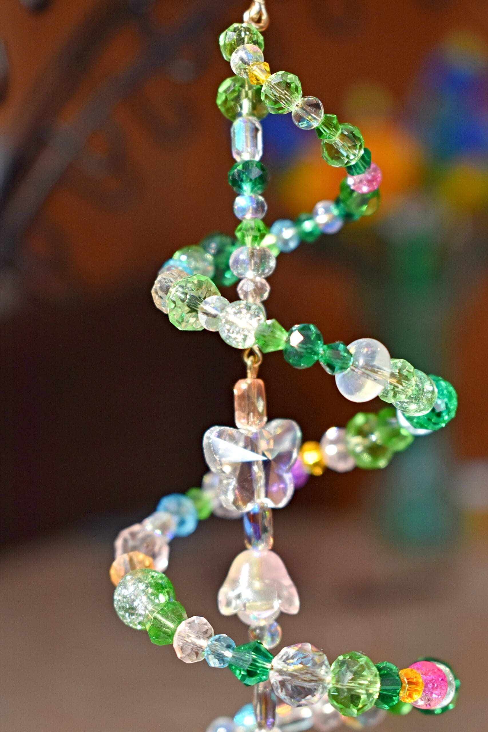 9 in. Long beaded wire sun catcher in a spiral shape with a butterfly, flower teardrop strand in the middle.