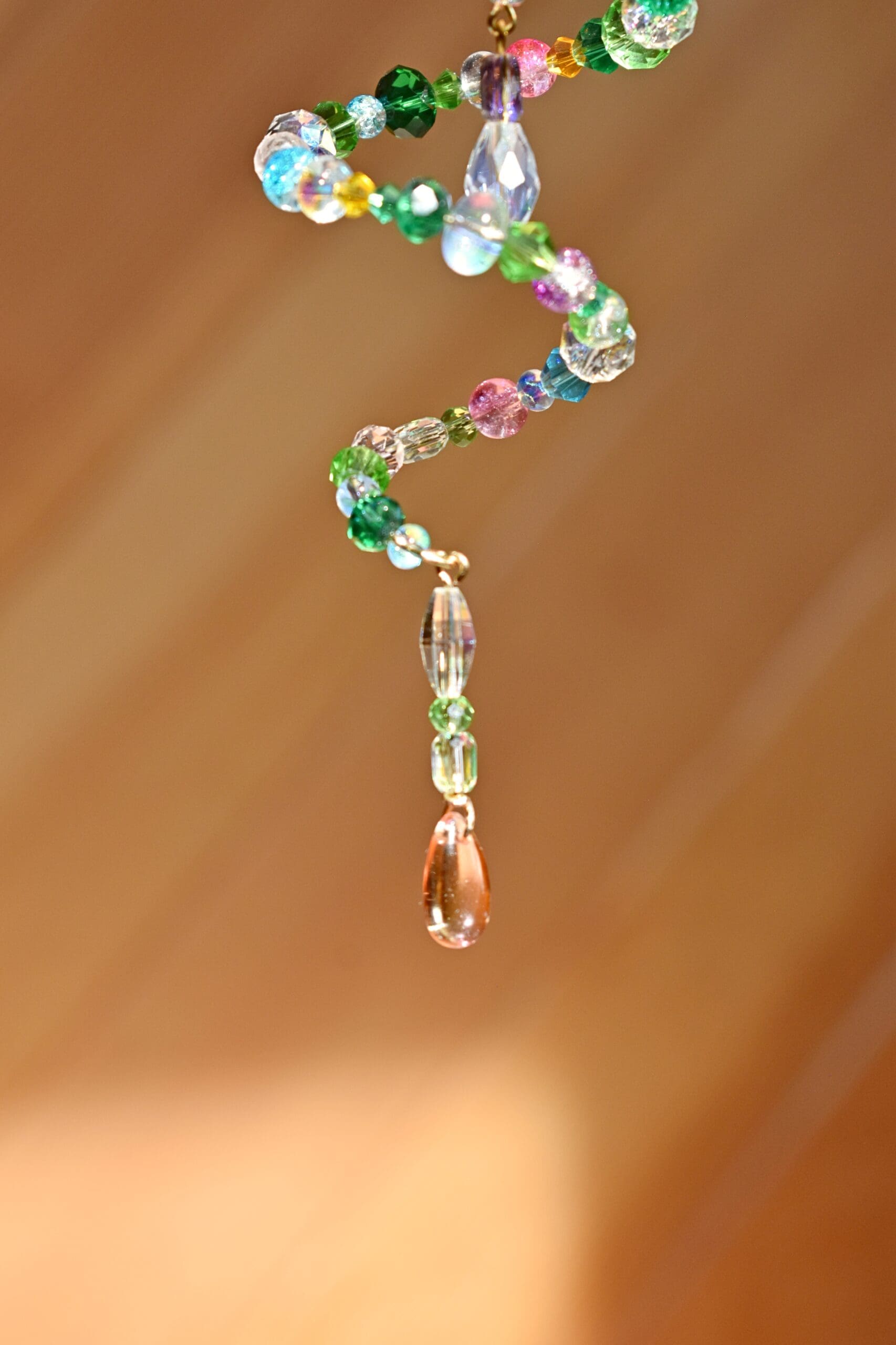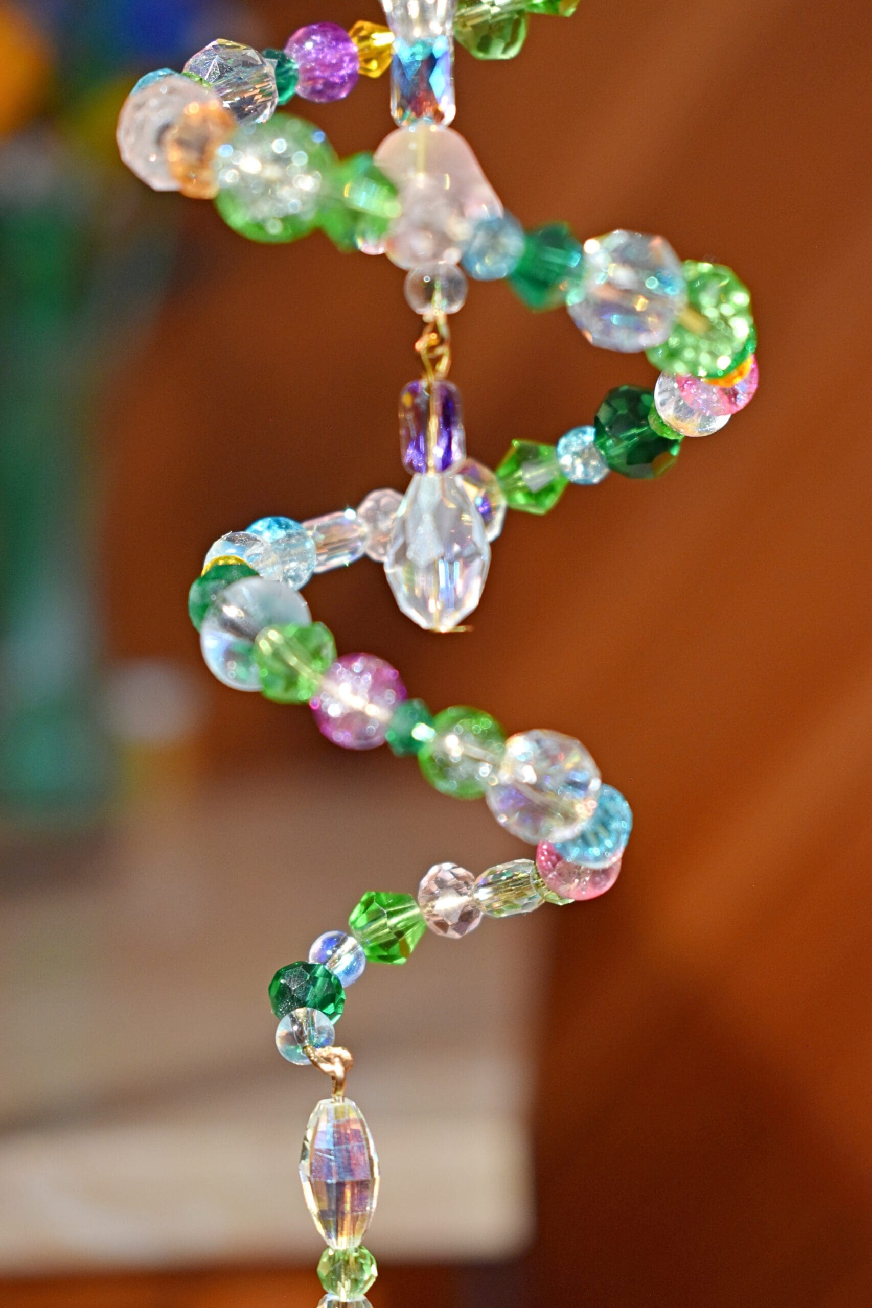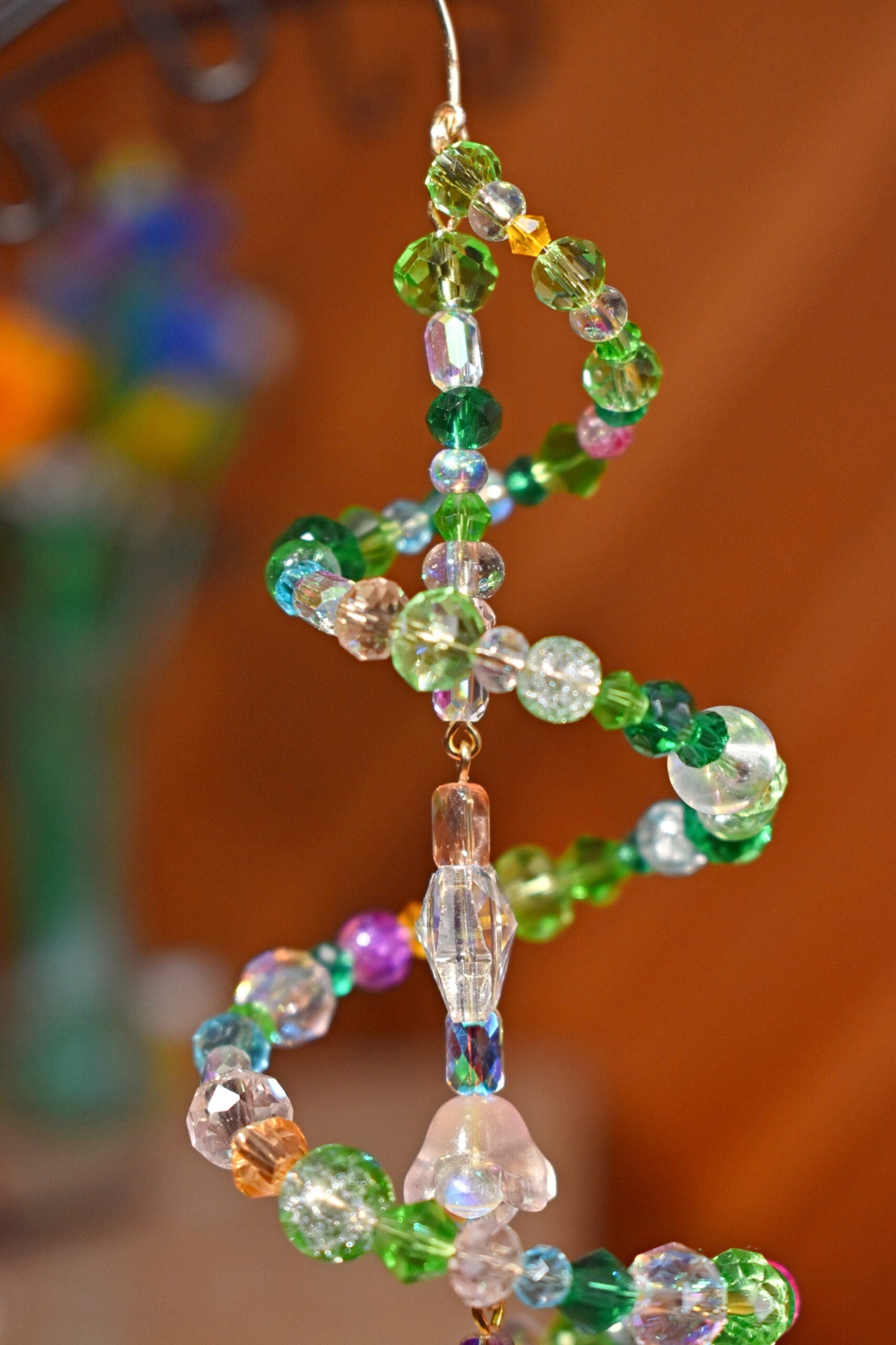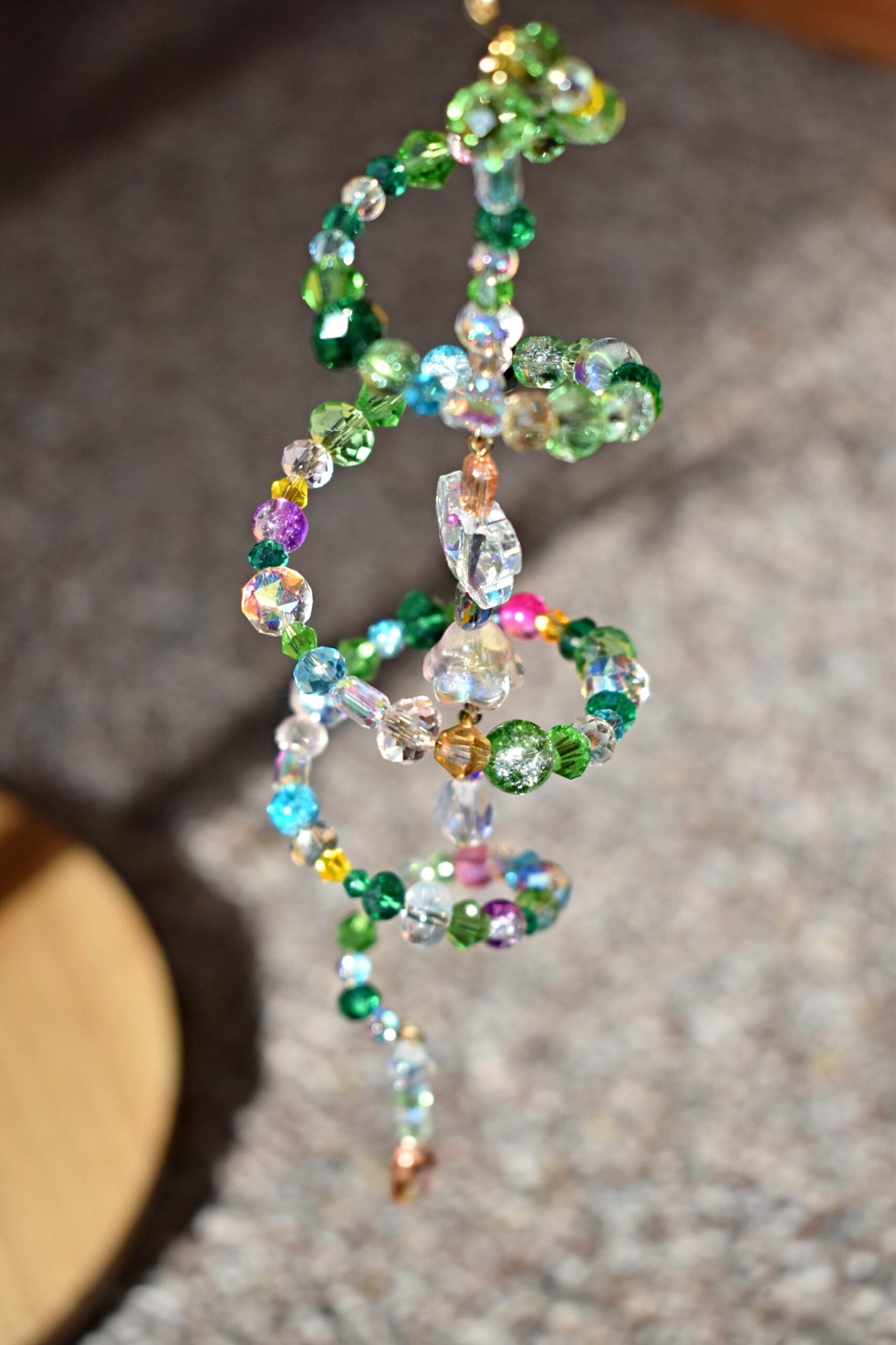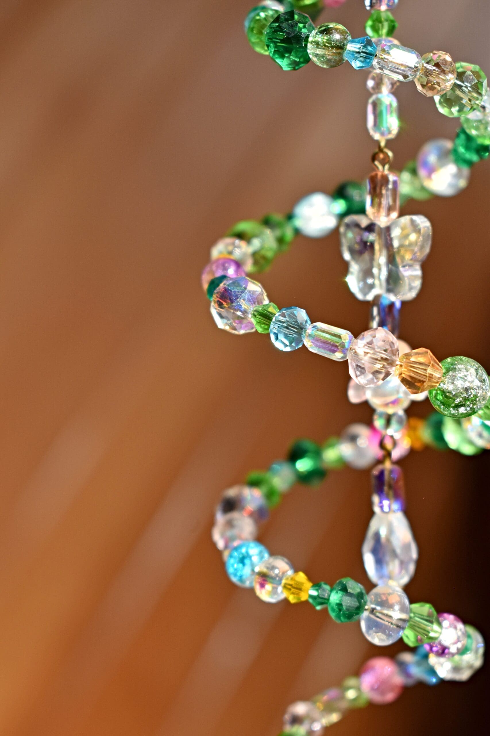 9 in. Long beaded wire sun catcher in a spiral shape with a butterfly, flower teardrop strand in the middle.