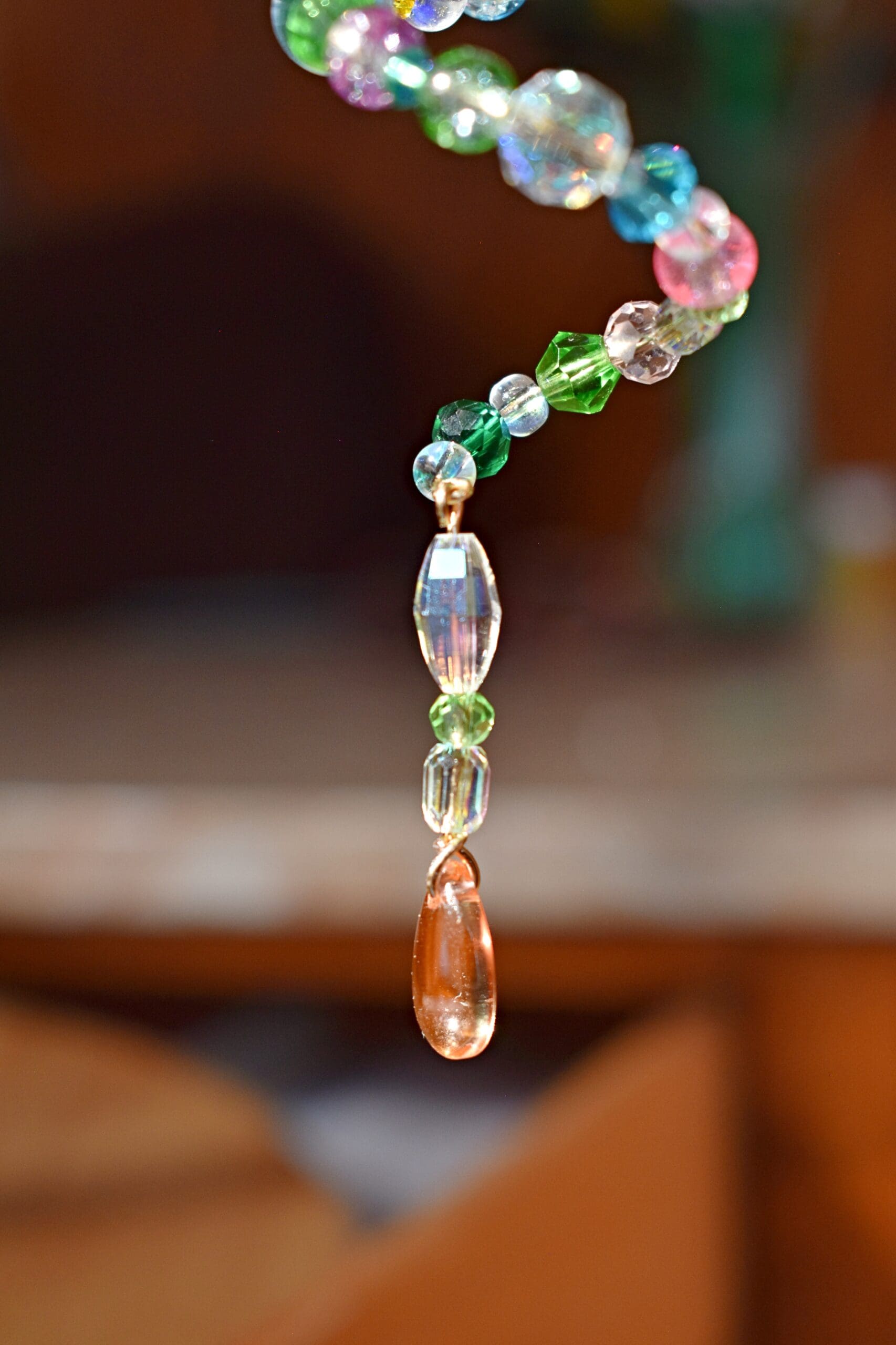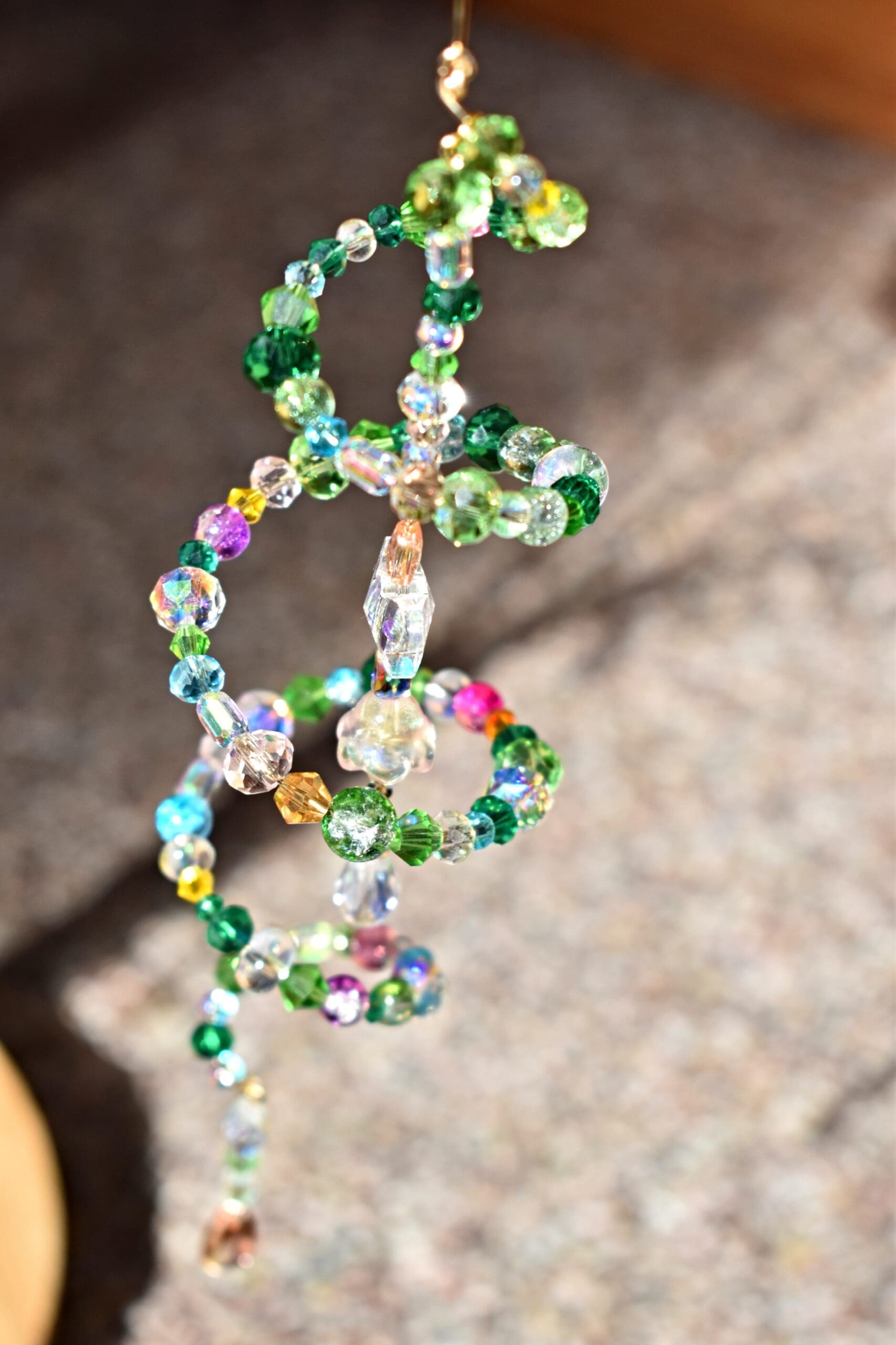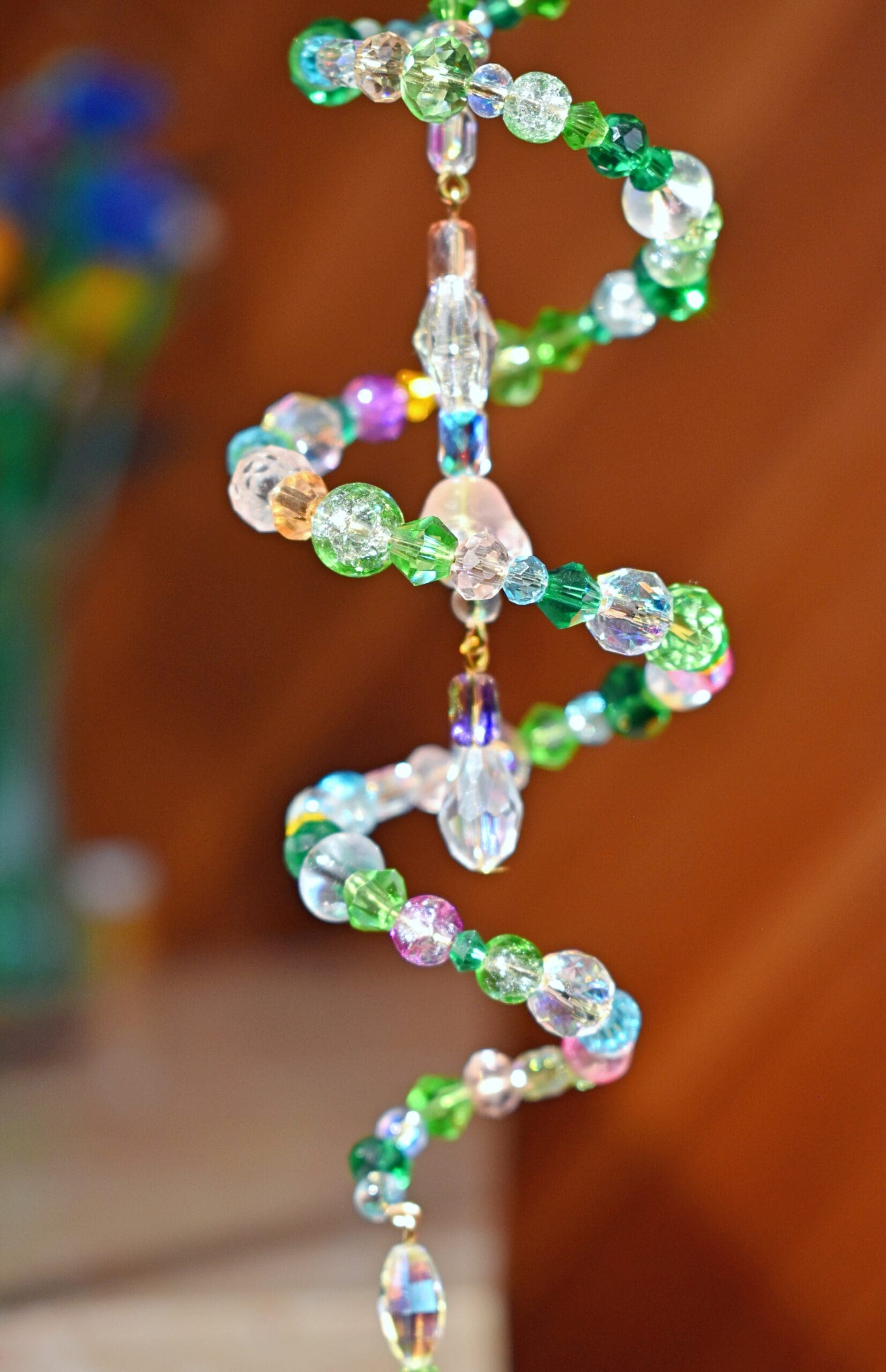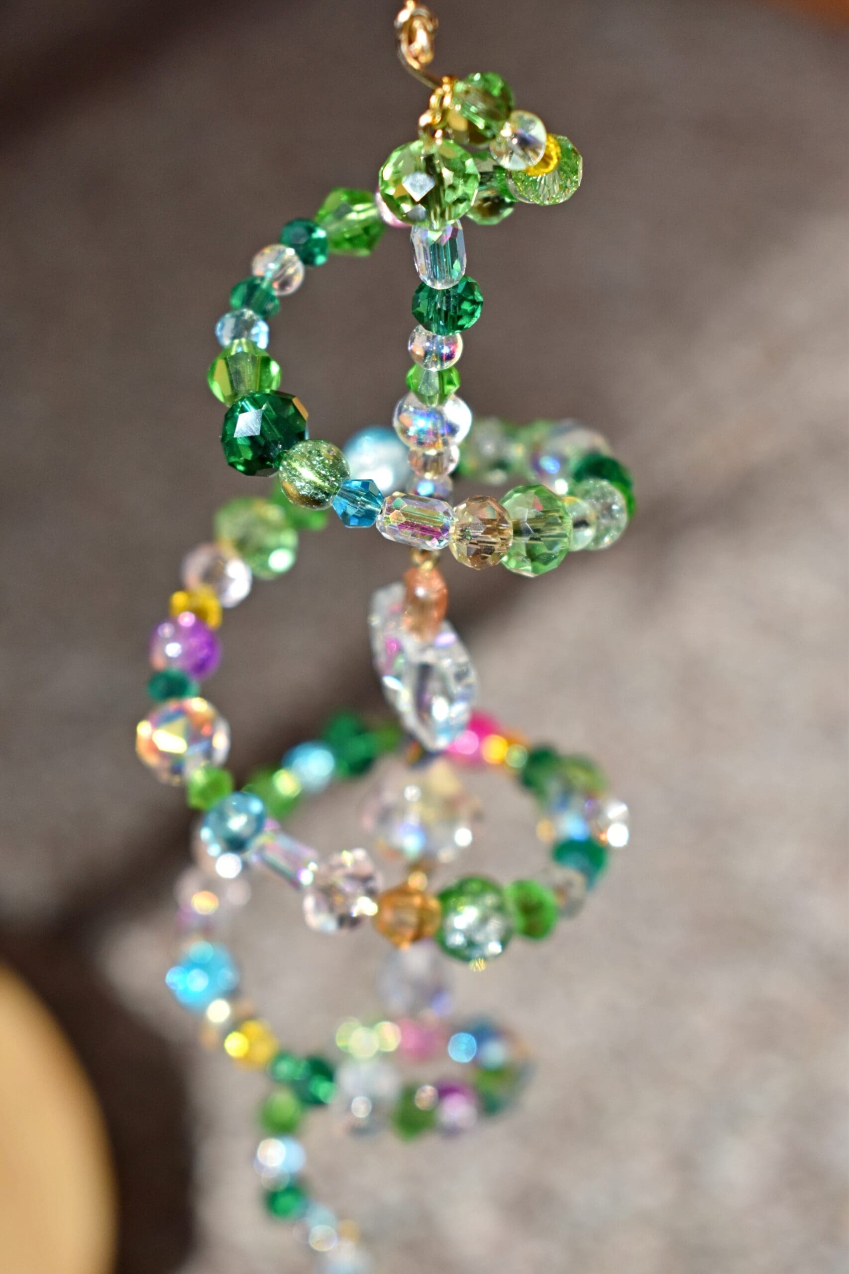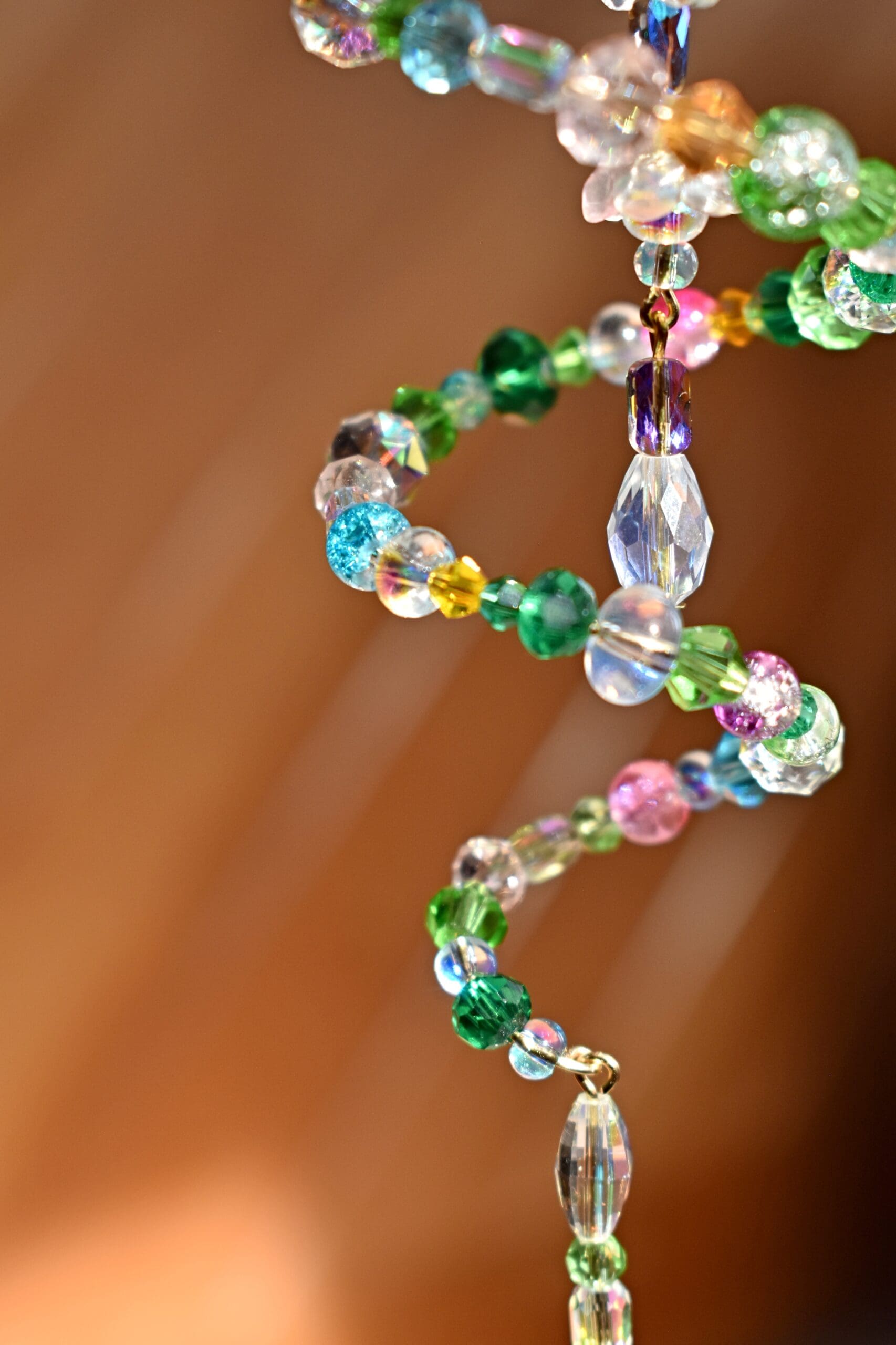 9 in. Long beaded wire sun catcher in a spiral shape with a butterfly, flower teardrop strand in the middle.